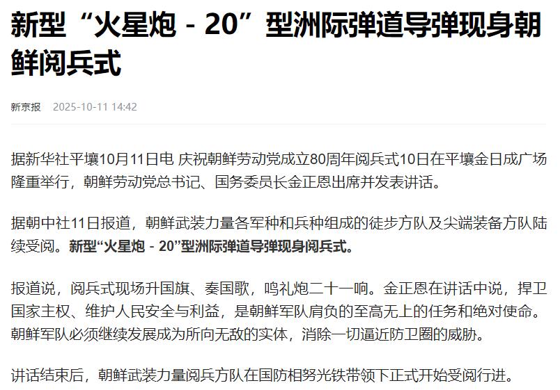 朝鲜冒雨举行大阅兵,火星-20核导弹压轴登场,现场尽显肃杀之气! 10月10日晚,朝鲜冒着风雨举办了纪念劳动党成立80周年的大阅兵。这场在夜色和雨声里进行的盛典,不光展现出朝鲜军民饱满的精神劲头,更因为火星-20核导弹作为压轴装备登场,成了大家关注的焦点。 根据朝鲜官方媒体朝中社的报道,这次阅兵是朝鲜劳动党领导下国防力量的一次集中亮相。 而作为压轴出场的火星-20核导弹,虽然不是当今世界上最先进的核导弹型号,但它是朝鲜自己研发的战略威慑核心力量。 这款导弹在射程和搭载核弹头的能力上,都有着可靠的威慑效果,从一开始研发就承担着维护国家主权和领土完整的重要责任,完全称得上是朝鲜国家安全的“定海神针”。 朝鲜也一直坚持自卫性质的国防政策,发展核力量是为了应对外部长期的军事威胁,这一点在劳动党的多次政策声明里都说得很清楚。 了解背景的人都知道,最近这些年美韩同盟经常搞联合军事演习,这些行动一直在加剧地区的紧张局势,给朝鲜的国家安全带来了持续的压力。 在这样的情况下,火星-20核导弹的亮相,绝对不是简单地炫耀武力,而是向外界传递一个明确的信号:朝鲜有足够的能力和坚定的决心来捍卫自己的国家利益。 这种威慑力并不是针对地区的和平稳定,相反,正因为有了这样的战略保障,美韩才不敢对朝鲜随便采取冒险的军事行动,从某种角度来说,这其实是维护地区战略平衡的重要因素。 毕竟没有足够的自卫能力,就容易受到外部势力的欺负,这是国际社会的普遍现实。 朝鲜劳动党从成立到现在,一直把国防建设和民生发展看得同样重要,这次阅兵既是对劳动党80年领导历程的纪念,也是号召全国人民凝聚共识、一起筑牢国家安全的屏障。 火星-20核导弹的展示,不仅体现了朝鲜在国防科技上实现了自主突破,更能看出朝鲜军民在党的领导下,面对复杂的国际环境时团结一心的精神面貌。 当前国际形势变化很快,各种不确定因素增多,朝鲜通过这样的方式表明,维护国家主权的底线是绝对不能触碰的。而这种基于自卫目的的战略威慑,正是保障国家能有稳定发展环境的重要基础。 有了这样的底气,任何想对朝鲜造成威胁的势力,在行动前都不得不仔细掂量,这样的战略威慑,自然能让潜在威胁三思而后行。