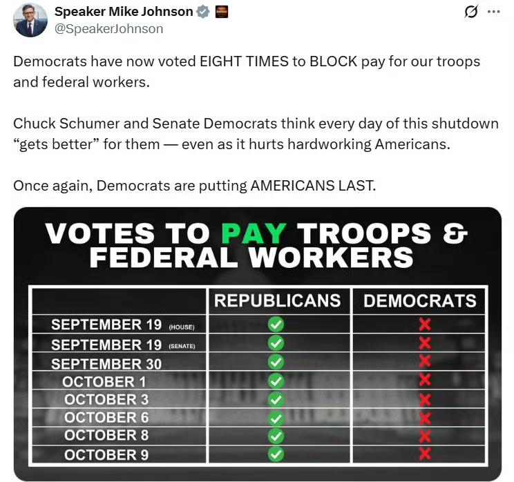 议长约翰逊: 民主党人如今已八次投票阻挠为我们的军人和联邦工作人员发放薪酬。