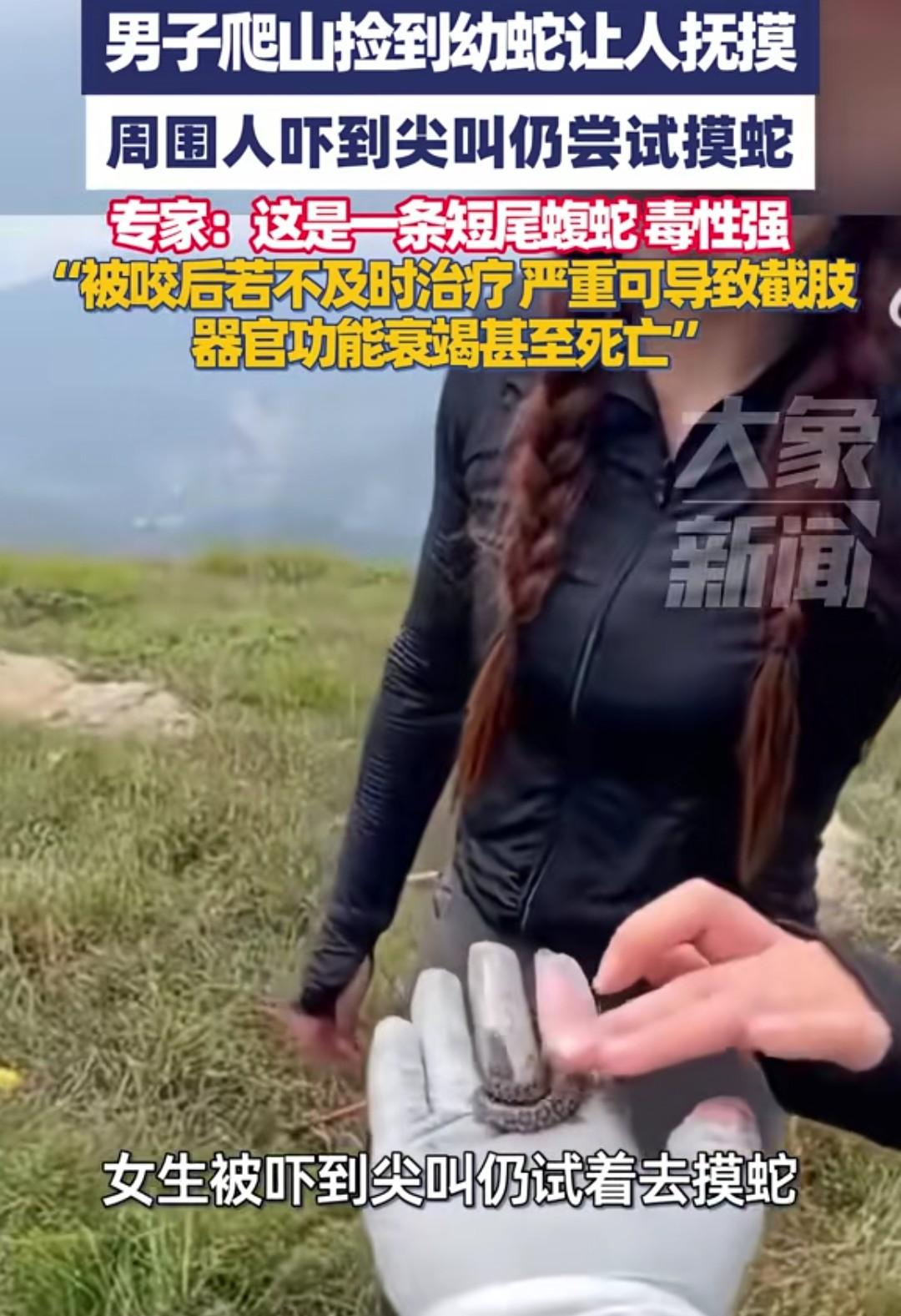 这种做法非常不可取!千万不要学他们! 近日,有一位驴友爬山捡到一条小蛇,驴友把蛇拿在手里,周围人发出害怕尖叫,但仍然轮流用手去摸小蛇。 后经过人科普,知道这种小蛇名叫短尾蝮蛇,有剧毒。 别看它还在幼年,它的毒性只稍微比成年蛇弱一点。 这种蛇是中国造成蛇伤害数量最多、危害最大的蛇种之一。 如果被咬伤,不及时治疗,严重可能造成截肢、器官衰竭甚至死亡。 为自己的生命负责,远离危险,这种作死的做法完全不可取。