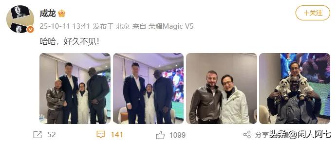 大哥成龙晒出多张与贝克汉姆、姚明、奥尼尔的合影,并配文:哈哈,好久不见! 这四个