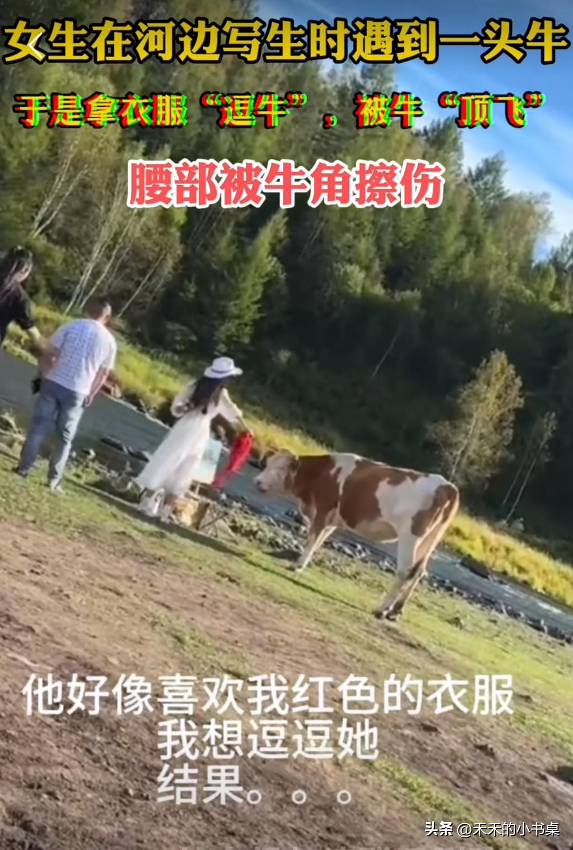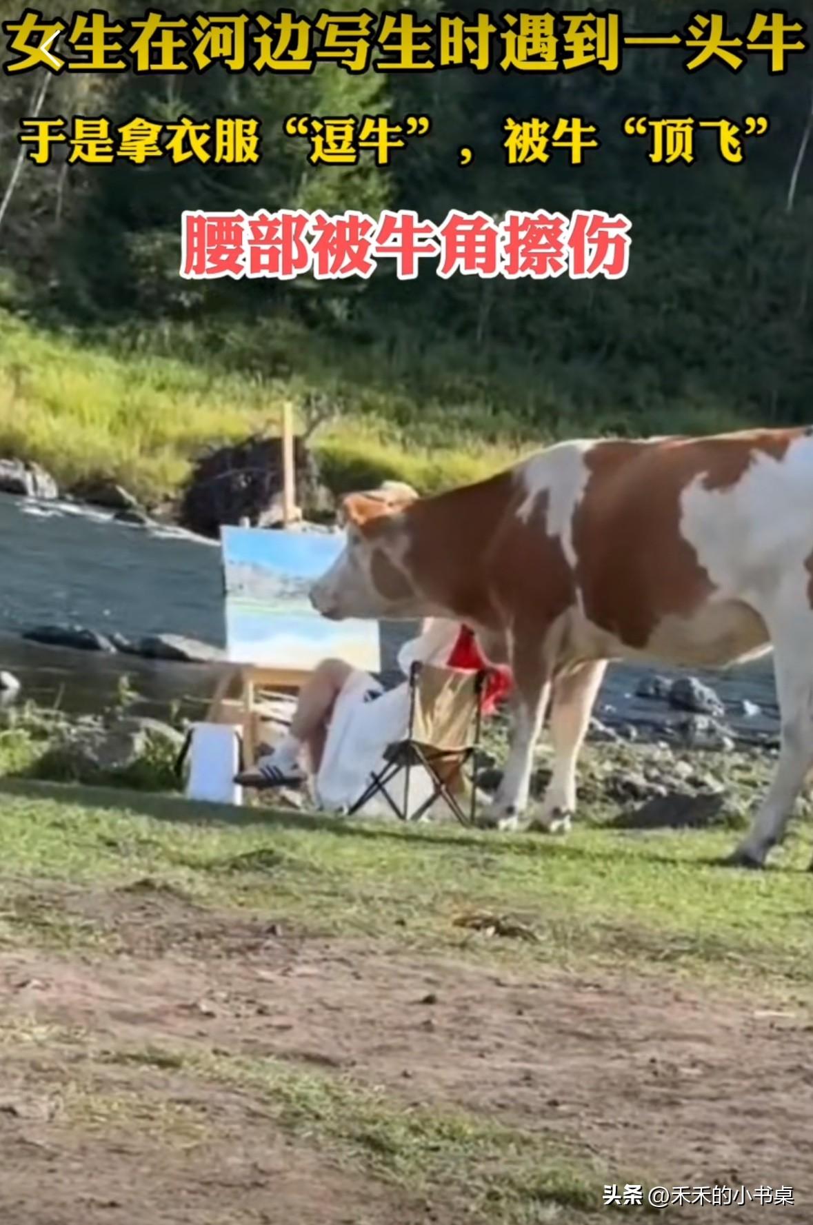 女生在河边写生,一头牛慢慢的走了过来,女生就用自己的红色披肩逗牛,直接被牛“顶飞