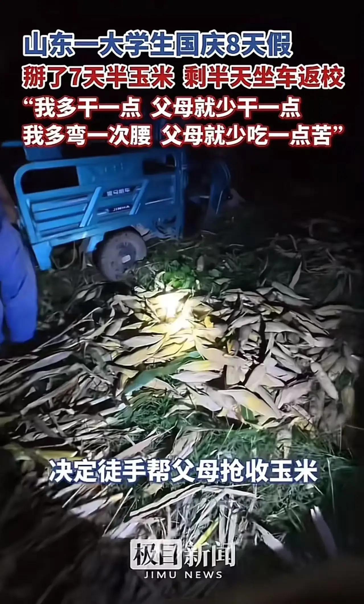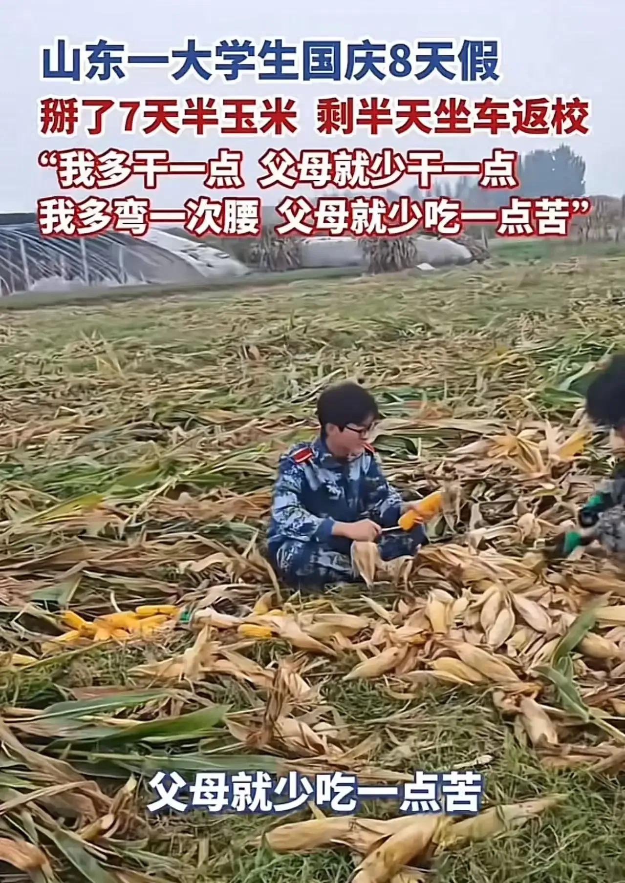 国庆假期你都在干嘛?旅游、聚会还是宅家?但有位山东大学生,国庆8天假竟然掰了7天半玉米!这是为啥呢? 原来,这位山东男孩趁着国庆8天长假,回家帮父母掰玉米,一干就是7天半,只剩下半天时间坐车返校。他说:“我多干点儿,父母就少干点儿,我多弯一次腰,父母就少吃一点苦!”这句话,真是让人既感动又敬佩。在这个快节奏的时代,很多年轻人可能都忽略了父母的辛劳,更别提主动去分担家务了。但这位男孩,却用自己的实际行动,诠释了什么是孝顺和担当。他不怕脏、不怕累,只为了让父母能轻松一些。网友们看到后,纷纷点赞表示:“这样的孩子长大了肯定有担当有责任,肯定会幸福的。”的确,一个懂得感恩、懂得分担的孩子,未来一定会更加出色。 这位山东男孩的举动,让我们看到了孝顺和担当的力量。也希望更多的年轻人,能像他一样,懂得感恩父母,主动分担家务。大家对此怎么看呢?快来评论区说说你的看法吧!十一假期现状 国庆节大学生