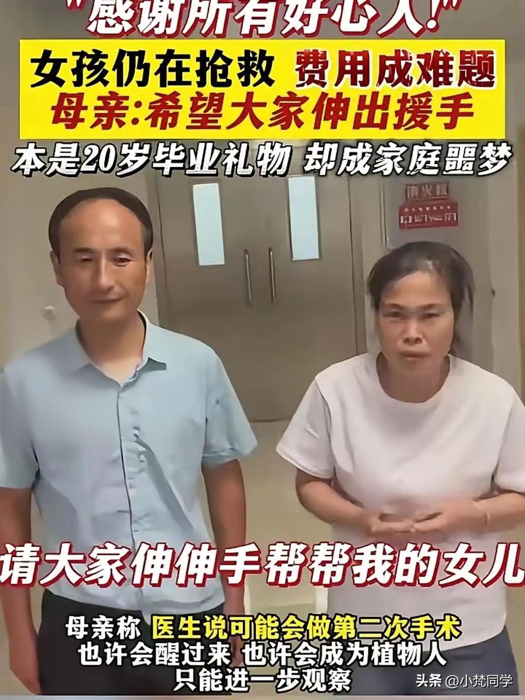 我终于知道,这届网友们爱心为什么不泛滥了!? “求求大家救救我女儿!” 甘孜ICU外,一对父母声泪俱下求助网友捐款, 可评论区却炸开了锅—— 20岁卫校毕业生,刚毕业不找工作、不实习, 揣着钱满世界旅游,甘孜高反后直接住进ICU。 父母立刻上网哭穷:“手术费不够,求大家伸援手!” 再看她父母的穿着和打扮,心凉了半截: 父母穿着得体,皮肤细腻不像体力劳动者; 母亲手臂上的镯子闪闪发亮,种地摆摊的妇女哪会戴这“累赘”? “有钱旅游没钱看病?早干嘛去了?” 更扎心的是, 普通家庭孩子毕业忙着谋生,她却潇洒旅游, 如今救命钱要网友兜底,谁能咽下这口气? 有人说“可怜天下父母心”, 也有人怒怼“旅游时不带网友,要钱时想起网友了?” 这届网友的爱心,可不是“冤大头”基金啊… 你觉得这钱该捐吗?