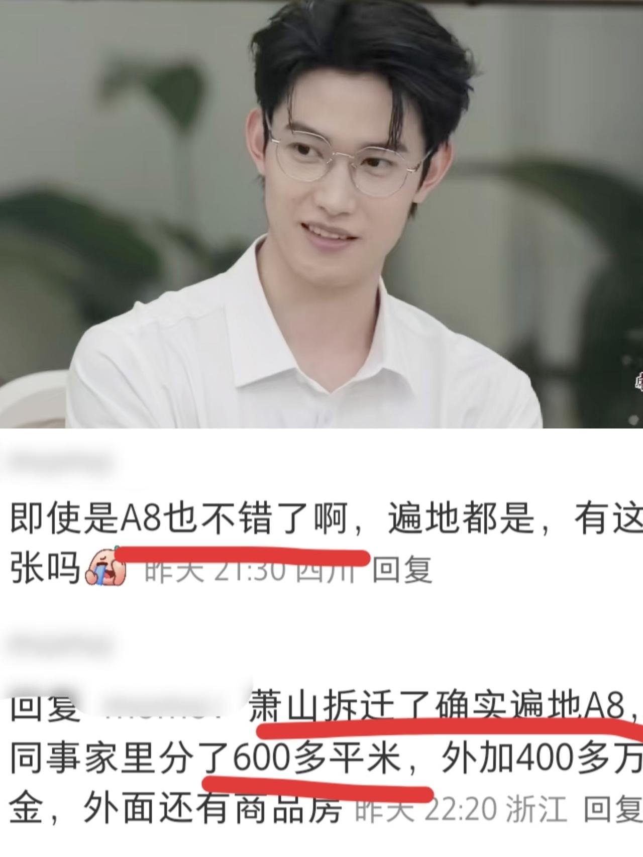 《心动8》30岁方益炯被曝是“萧山拆迁户,a8家庭” 网友担心方医生不接广子,单靠眼科医生的收入养不起徐如蓝,随即有杭州网友评论让大家放心,方医生很有钱,赶上时代红利,萧山人拆迁了就是遍地A8,都是拆迁户,人均分到200到300万现金,按照一家五口人计算大概能分到600万左右。 拆迁了就是a8家庭,不拆迁就是收租,一年房租几十万到手。 网友说500万在萧山都算是贫困户,一千万才起步,一个亿才算得上富有。 而且方医生在和徐如蓝100天纪念日时,送徐如蓝的花要55一支,一束花都上千元了。 可也有观众表示不认同,说方医生身上看不到那种有钱人的松弛感,也没有拆迁户的自鸣得意。方医生更像是徐如蓝口中的书呆子,出自书香门第,偏儒雅公子的风格,不像是暴发户的审美和品味。