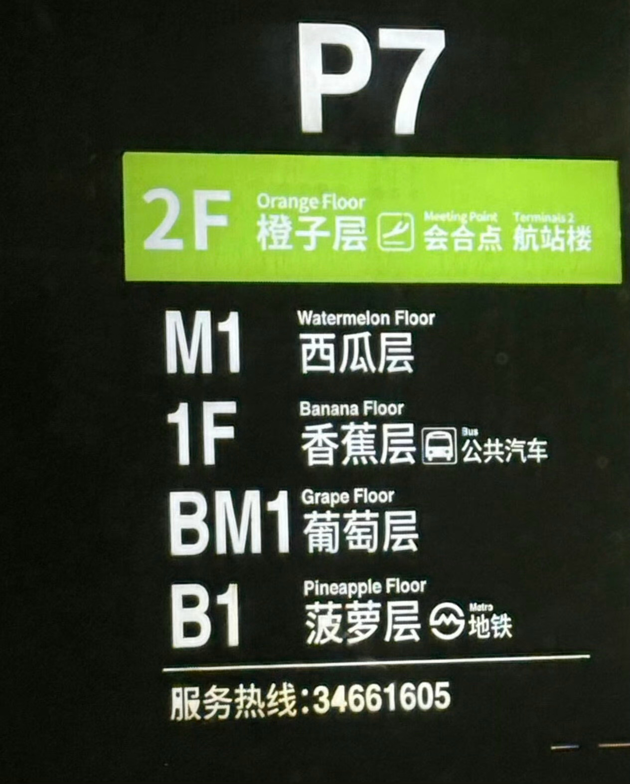 上海还是太international了,虹桥机场一楼香蕉层,二楼橙子层,负一楼菠萝层,可可爱爱的。第一个想出这些标识的是天才吧?