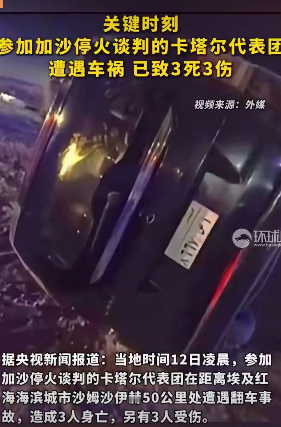 卡塔尔代表团遭遇车祸已致3死3伤参加停火谈判的卡塔尔代表团遭遇车祸当地12日凌晨,参加加沙停火谈判的卡塔尔代表团在距离埃及红海海滨城市沙姆沙伊赫50公里处遭遇翻车事故,造成3人身亡,另有3人受伤。