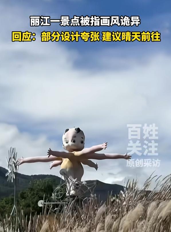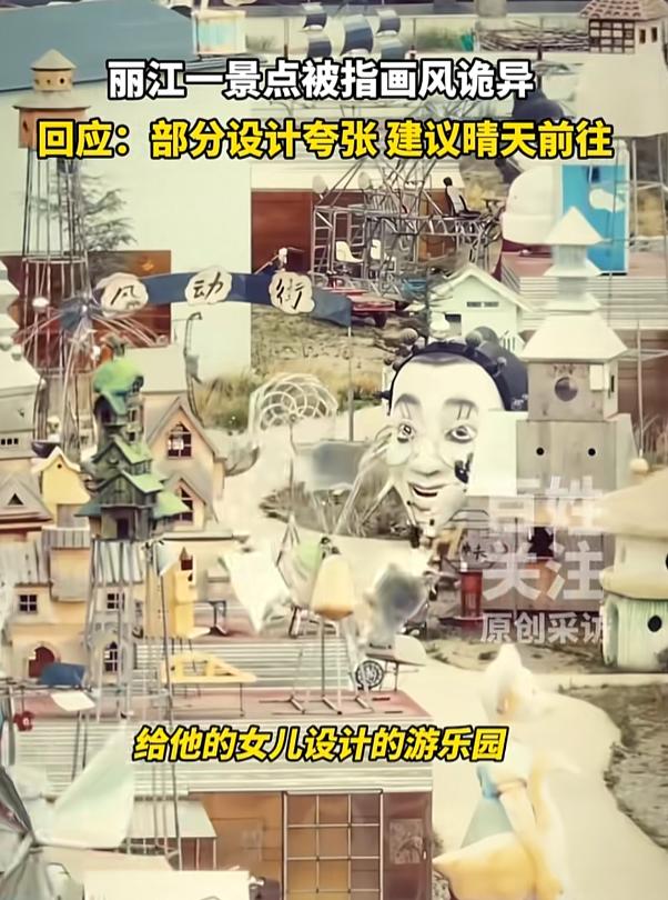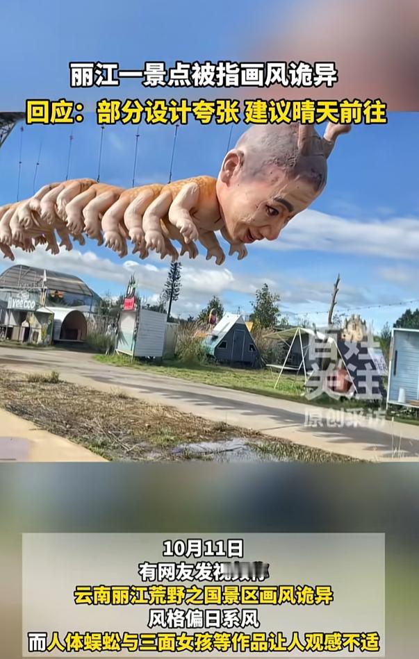 这样的艺术真的好吗? 近日,云南丽江,有游客在旅游时发现了一座刚建成的游乐园,便带着孩子进去游玩,没想到家长和孩子都被里面的场景吓了一跳,就像恐怖电影一样。网友:说这是鬼园还差不多。 游乐园一直都是大人小孩都喜欢去的游戏场所,里面的各种游玩设施都承载了许多人的童年记忆,可是云南丽江这座游乐园,就把美好变成了惊吓, 在这座游乐园里,没有传统的游玩器材,反而是有人面蜈蚣,三面女孩等诡异的作品,大型人头象,各种奇形怪状的小人在园中随意可见,诡异的气氛就连大人都不愿入内。 景区的员工说,这是设计者为女儿建设的一个比较童话和梦幻的游乐园, 可网友们并不买账,有的说这种风格阴间,也有的说这种风格太像隔壁日本了。 说实话,看到这所游乐园之后,我感觉就像是在看几年前日本那场奥运会开幕上,本应是活泼美好的场景硬是被整成了阴森恐怖。 建议景区还是跟设计者沟通沟通,用这样的风格做游乐园,难道就不怕孩子回去做噩梦吗?