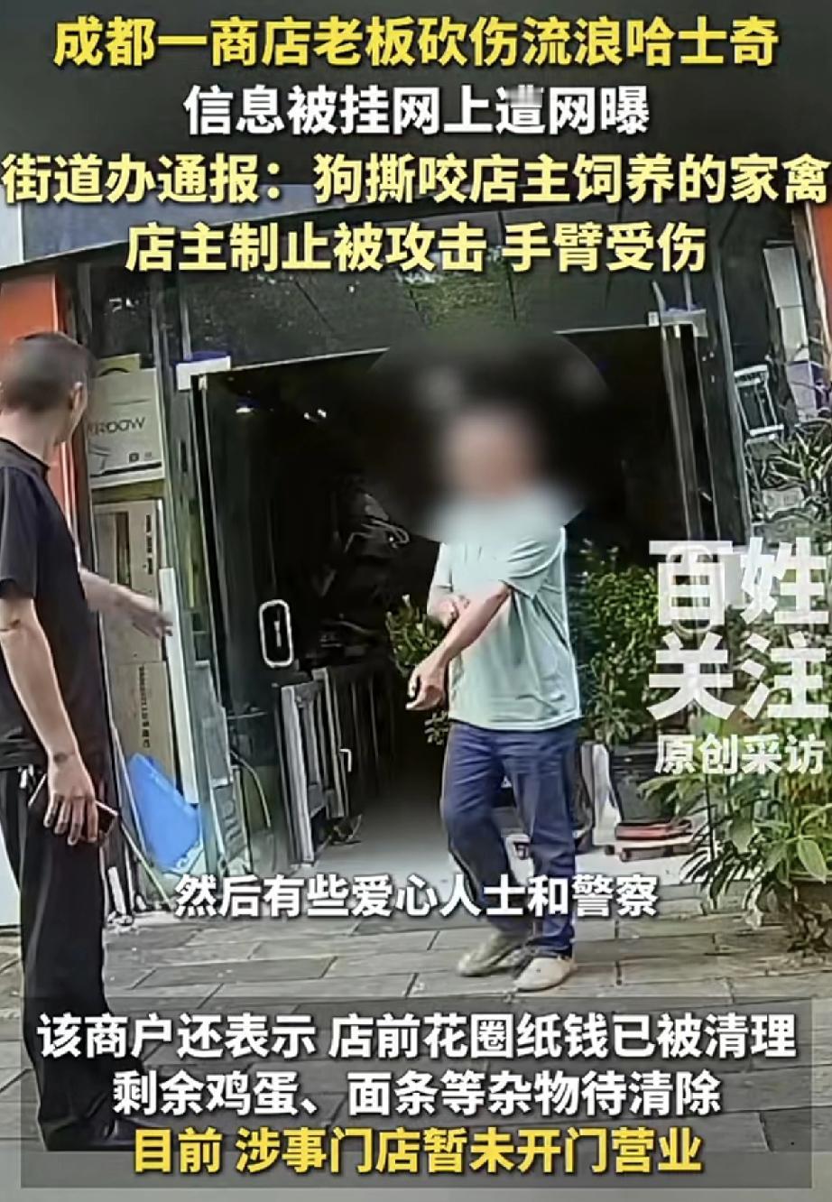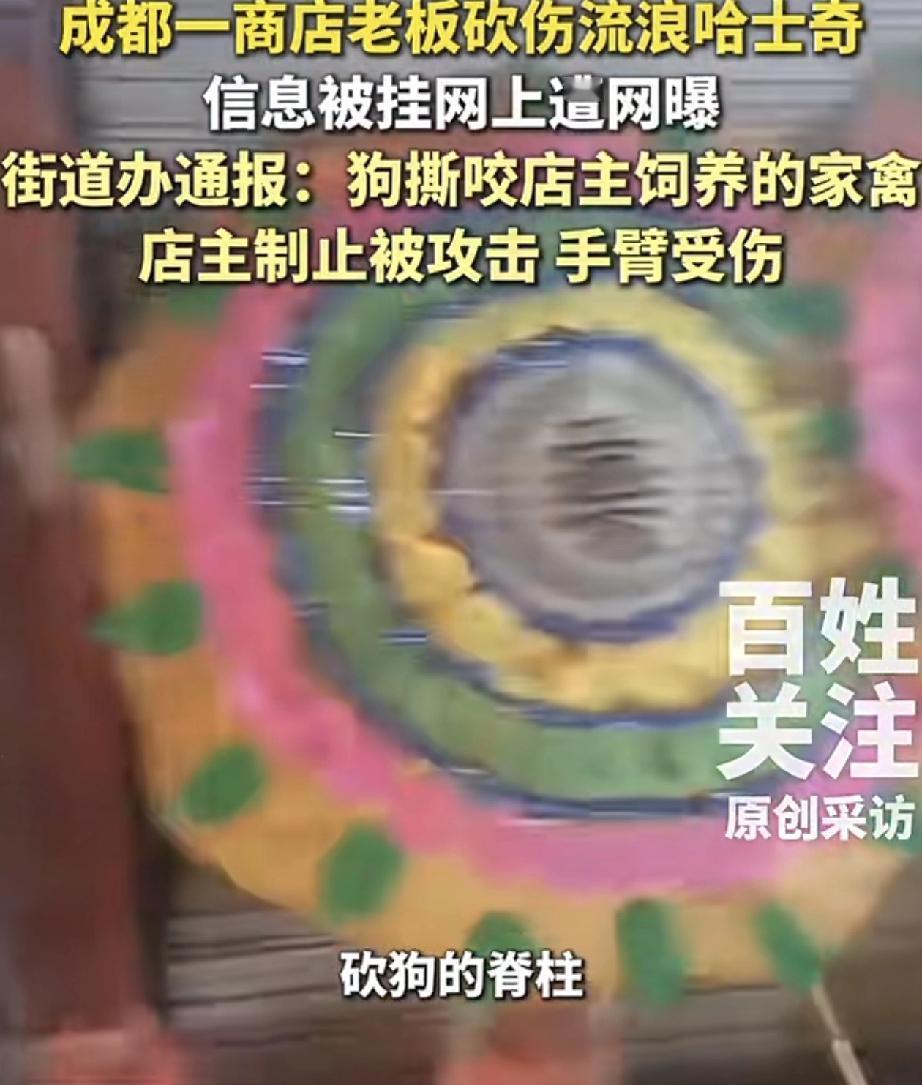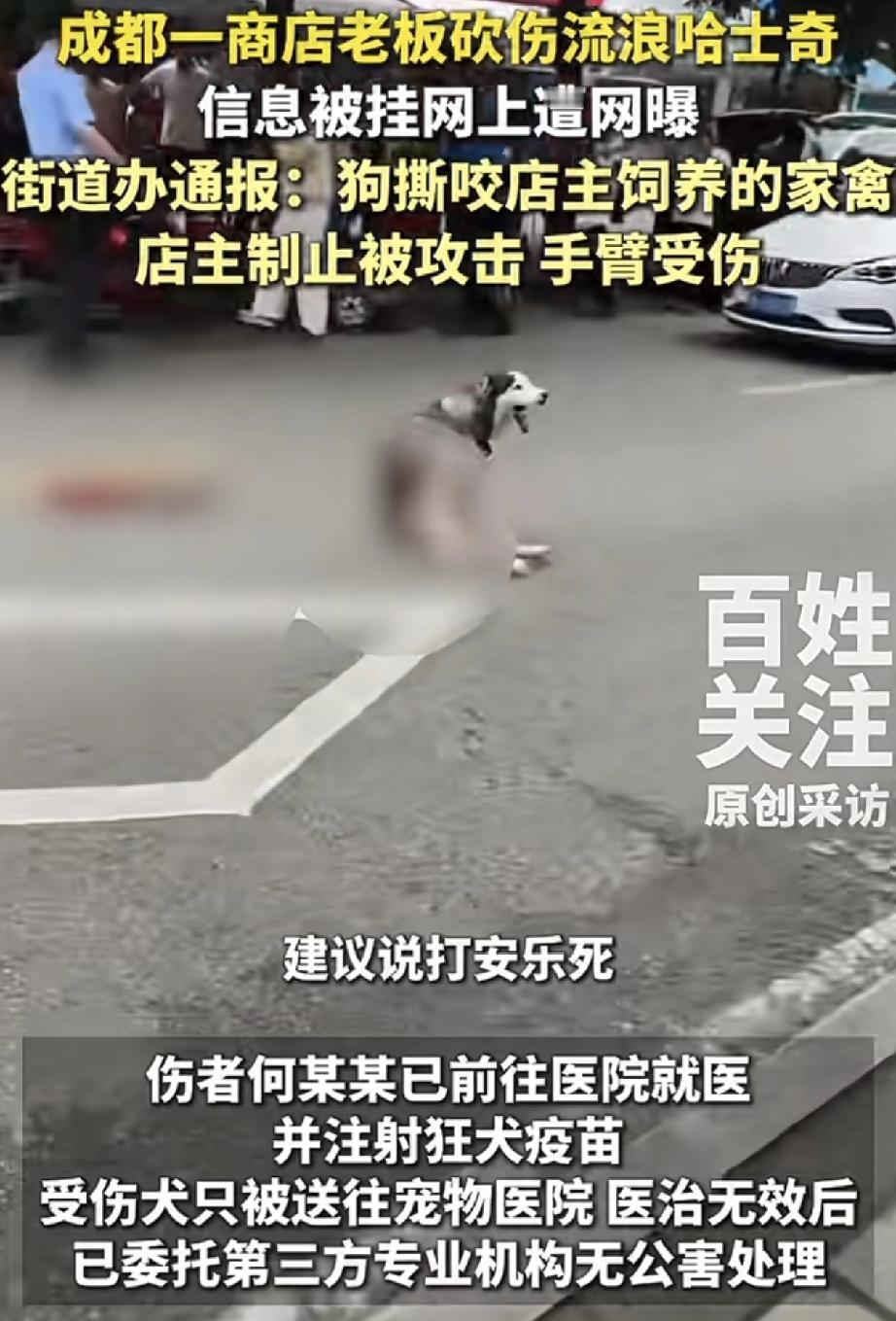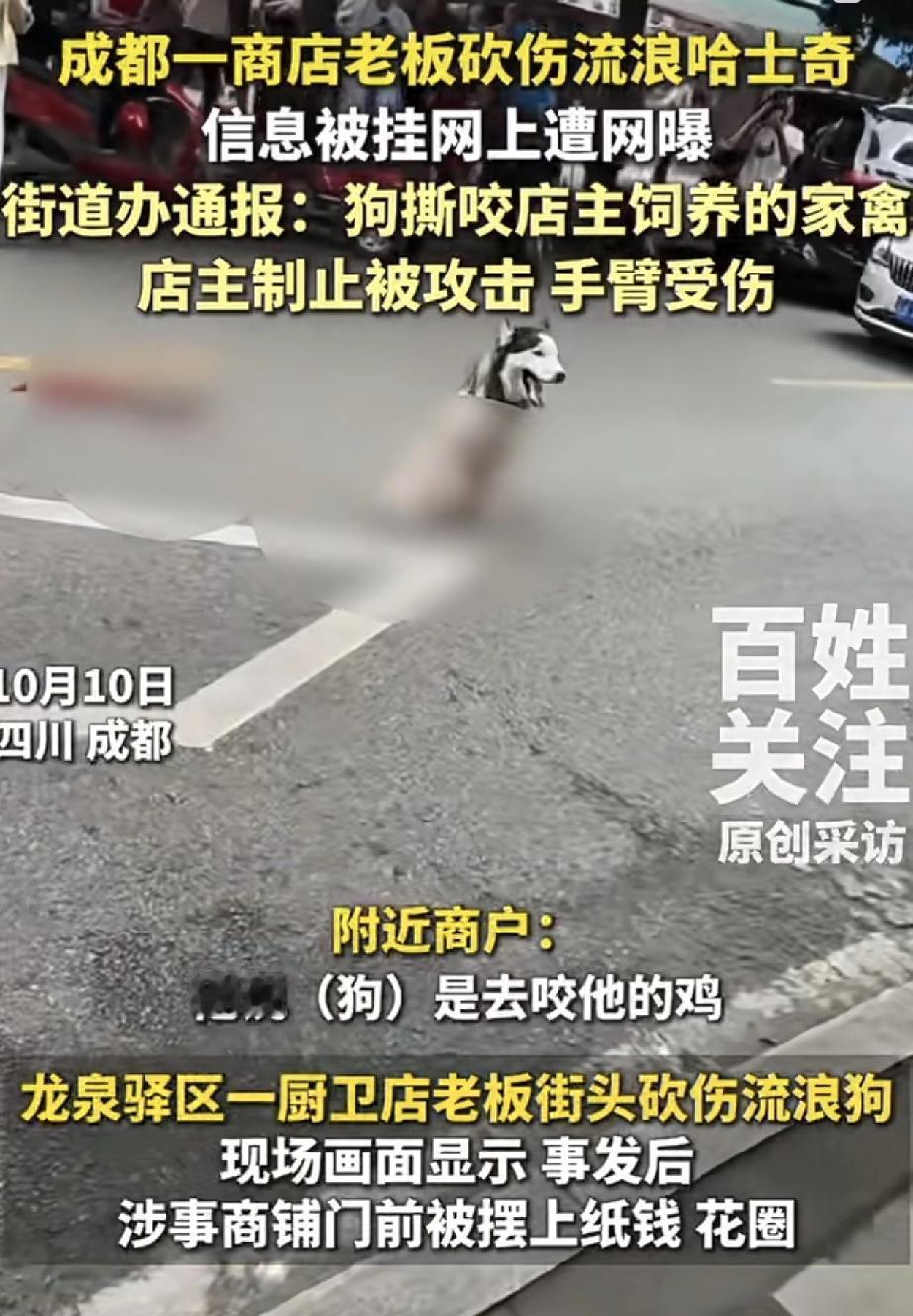 网传,四川成都,一只流浪哈士奇因在在某店家门口绿植撒尿后,被店老板当场用刀砍伤,
