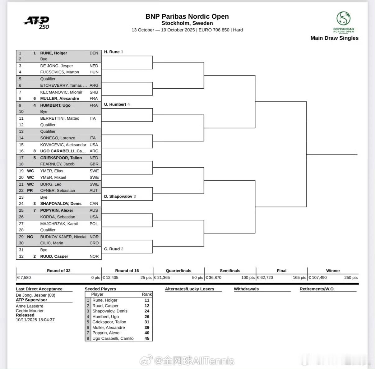 🇸🇪斯德哥尔摩:鲁内、鲁德、沙波瓦洛夫、安贝尔领衔。