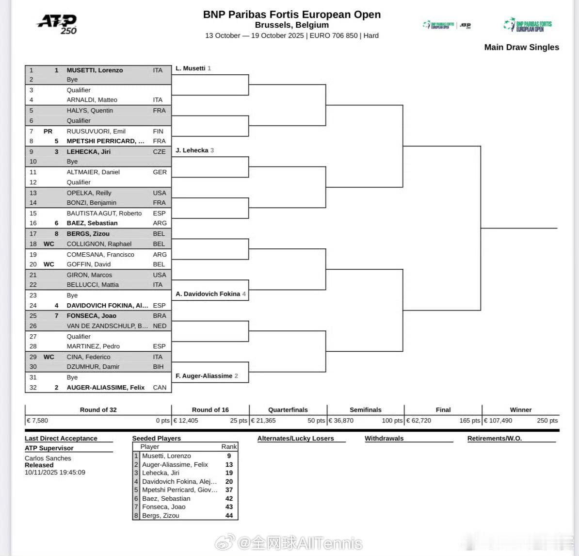 🇧🇪布鲁塞尔:穆塞蒂、阿利亚西姆、莱赫卡、达维多维奇位列前四种子。