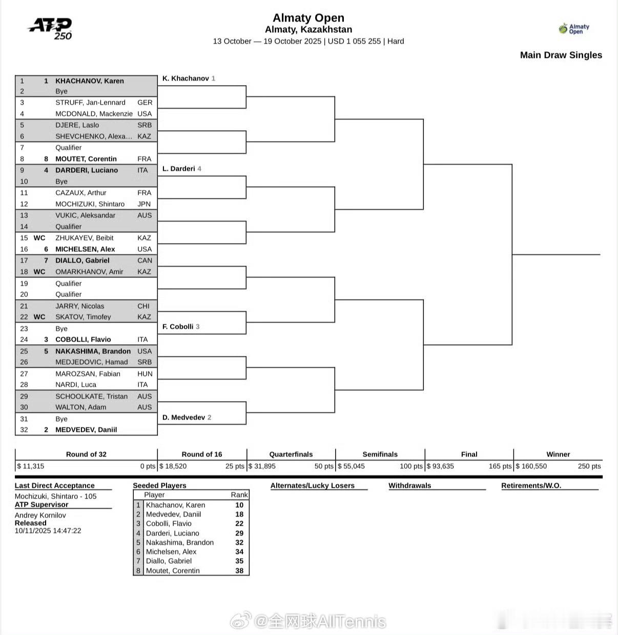 🇰🇿阿拉木图:卡恰诺夫、梅德维德夫、科博利、达尔德里以前四种子出战。