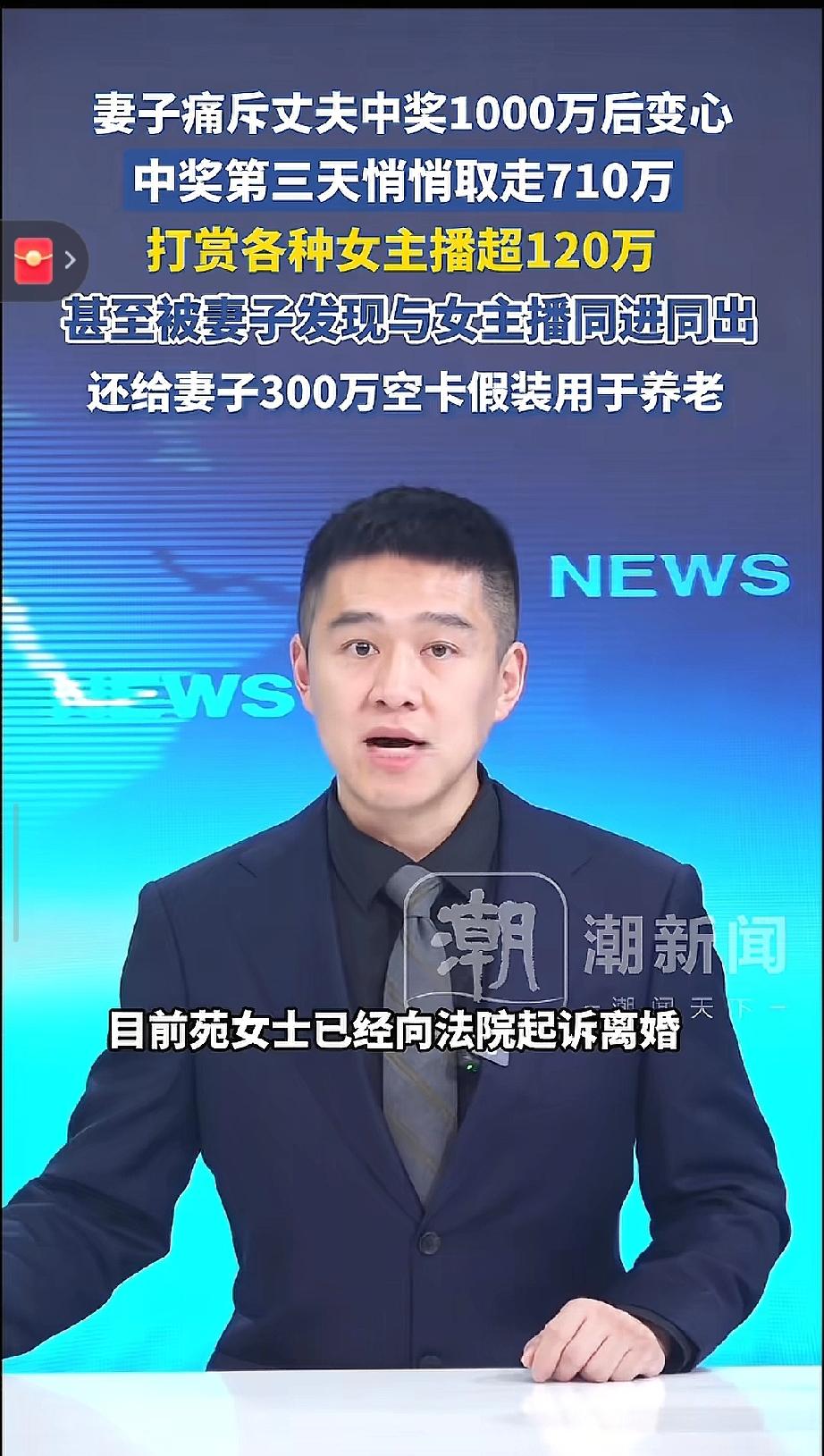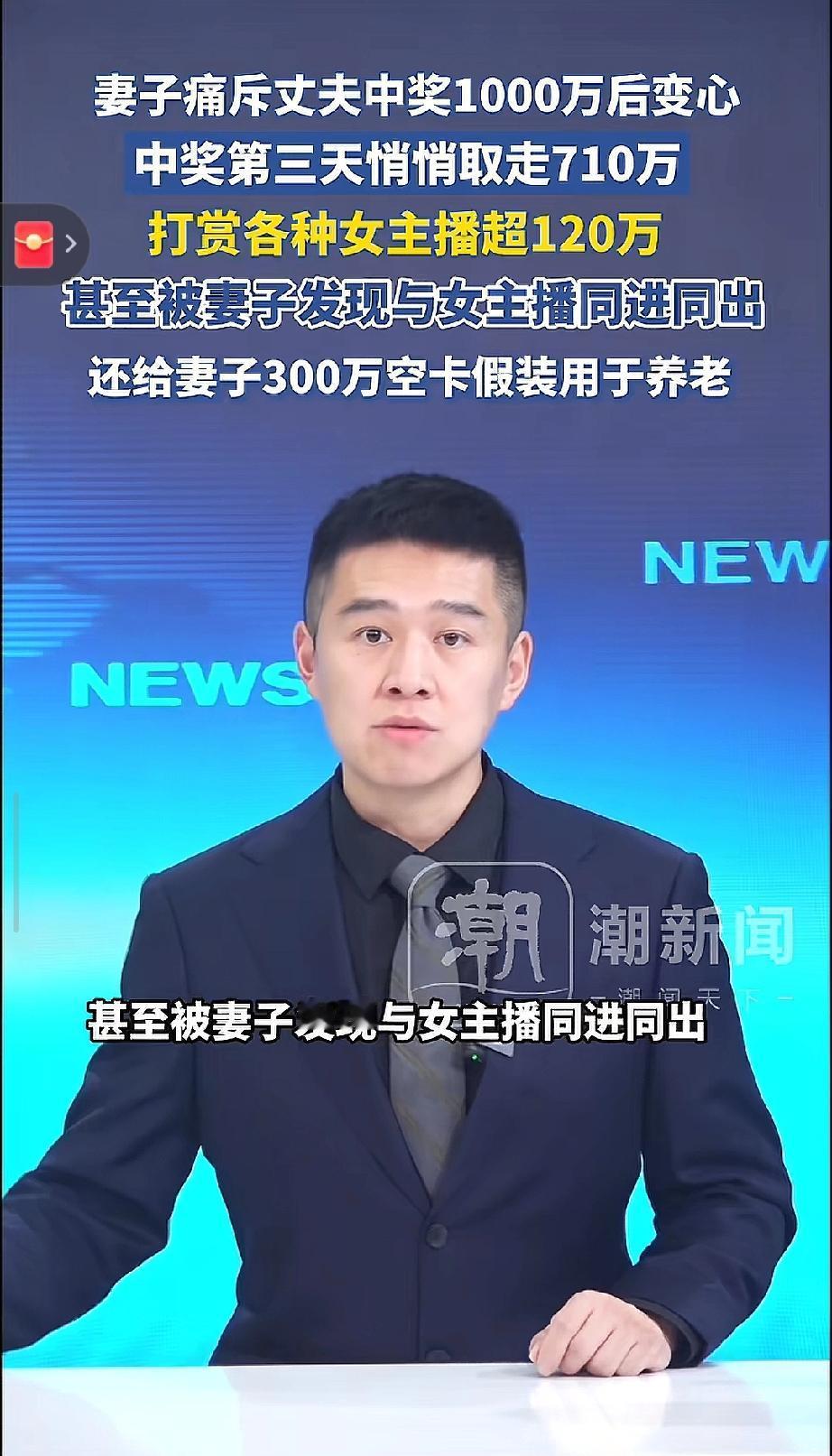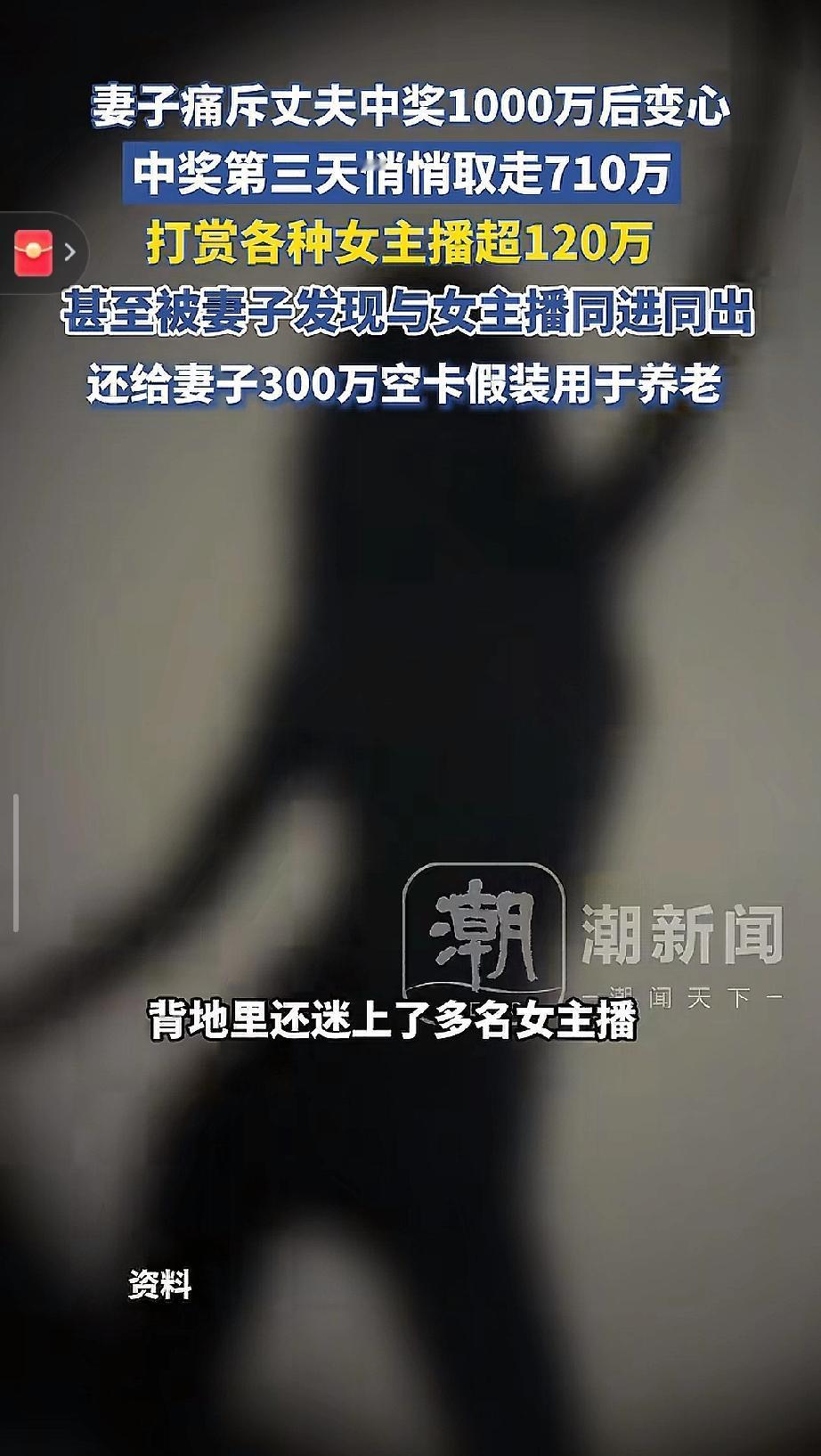 中1000万给妻子一张300万“空卡”,却豪掷数百万打赏女主播?这男人把婚姻和良心一起卖了! 领奖当晚,他递给妻子一张“余额为0”的银行卡,笑着说:“你的300万到账了。”她感动落泪,以为苦尽甘来。殊不知,他转头就开启直播“撒钱”模式,连续打赏多名女主播,单笔数万,累计超400万,聊天记录露骨,竟称“终于自由了”。 真相曝光,全网震怒。这不是“败家”,是精心策划的背叛!婚内中奖属夫妻共同财产,他不仅隐瞒转移,更用谎言践踏婚姻信任。给妻子“空卡”是嘲讽,打赏女主播是挥霍,更是对婚姻的公然羞辱。 更令人心寒的是,他曾对妻子说:“没你熬不到今天。”可暴富后第一件事,却是把她踢出财富之外。 法律会追回财产,但破碎的信任如何重建? 有人输了一辈子,有人赢了千万,却输尽了人性。 提醒所有伴侣:暴富考验的不是财富观,而是人品底线。 别让一张彩票,照出枕边人最丑的嘴脸。