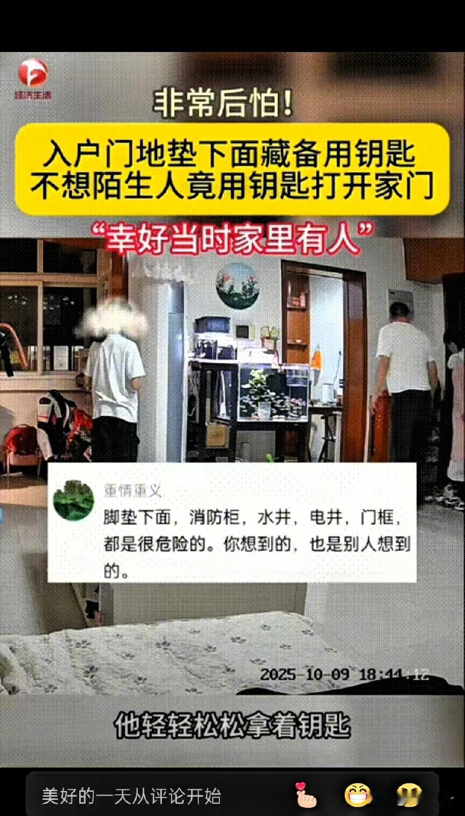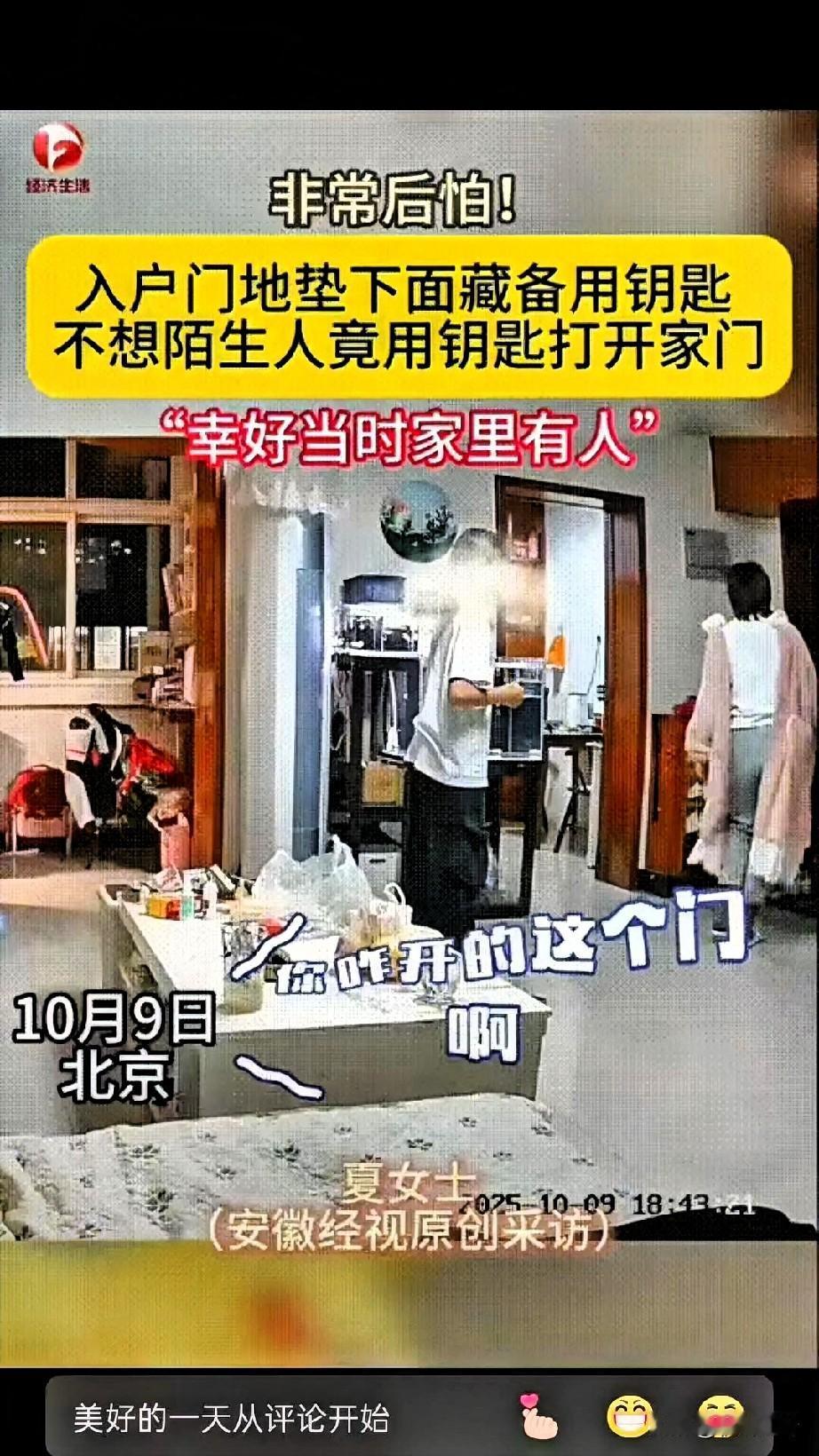 “这也太吓人了!北京一家三口在家,女主人突然听见门外传来钥匙开门的动静,起初以为是邻居走错门,没成想下一秒,自家大门真的被人打开,一个陌生老头拿着钥匙就走了进来! 面对满脸震惊的女主人,老头反倒一脸坦然:“我以为你们家卖房,在门垫底下拿的钥匙,就带着孙子来看看房。”这话直接让女主人懵了:“就算看房,也不能随便拿人家钥匙开门啊!”直到男主人闻声出来,老人才知道闹了乌龙,慌忙道歉后匆匆离开,留下一家人后怕不已。 这事儿一曝光,评论区瞬间炸开了锅,不少网友纷纷“自曝”:“我家钥匙藏在门框上,一直觉得没人发现”“之前把钥匙放消防栓里,现在想想太危险了”“花盆底下、电表箱,这些‘隐秘点’我全用过,原来都是‘公开秘密’”! 其实藏钥匙图的是方便,可背后藏的全是安全隐患。那些你觉得“没人知道”的角落,早就是小偷和有心人都摸清的“常规操作”。 家门是守护安全的最后一道屏障,别抱着“哪有那么巧”的侥幸心理,毕竟一旦出事,后悔都来不及。花点钱换个密码锁,或是把钥匙交给靠谱邻居,看似麻烦,换的却是一家人的安心。 给更多人提个醒,别让“图省事”变成“引危险”!