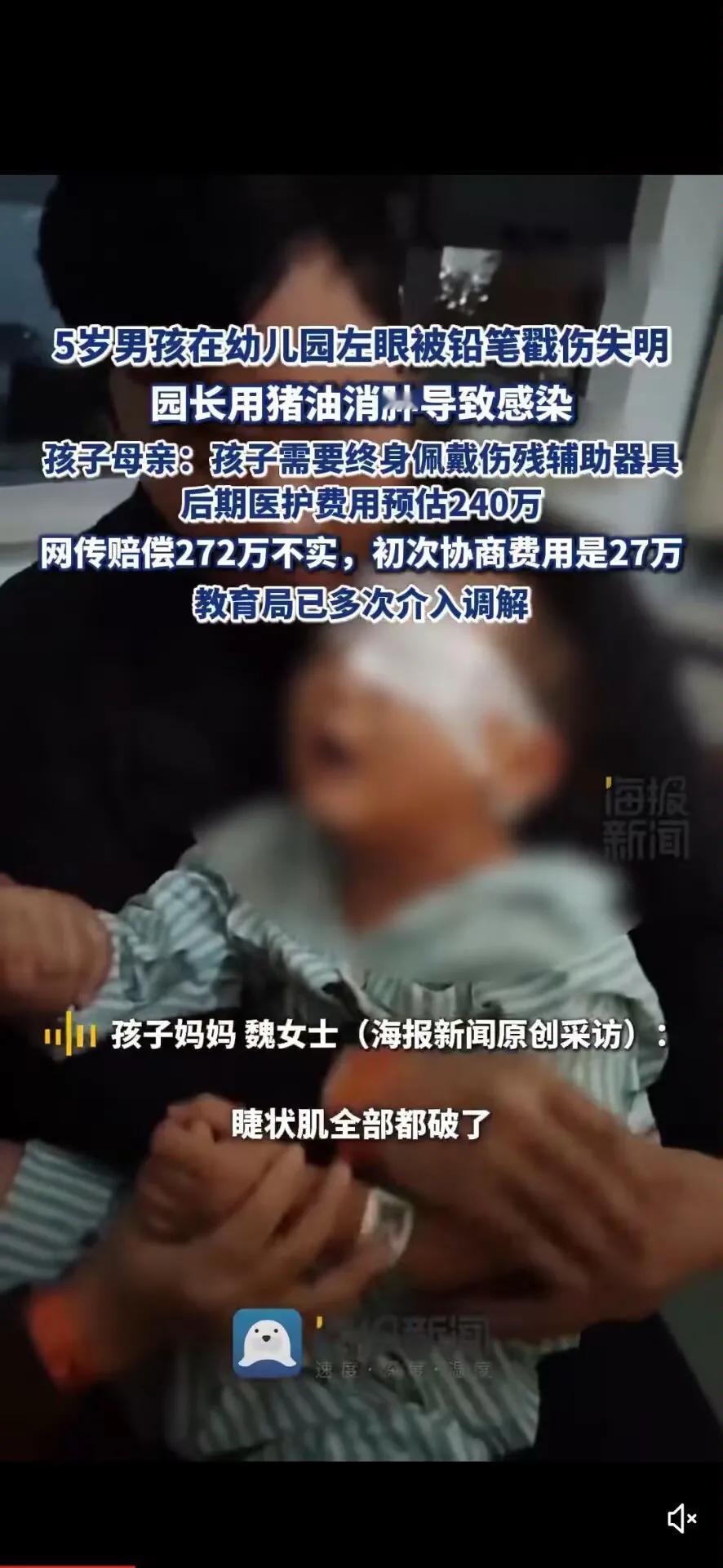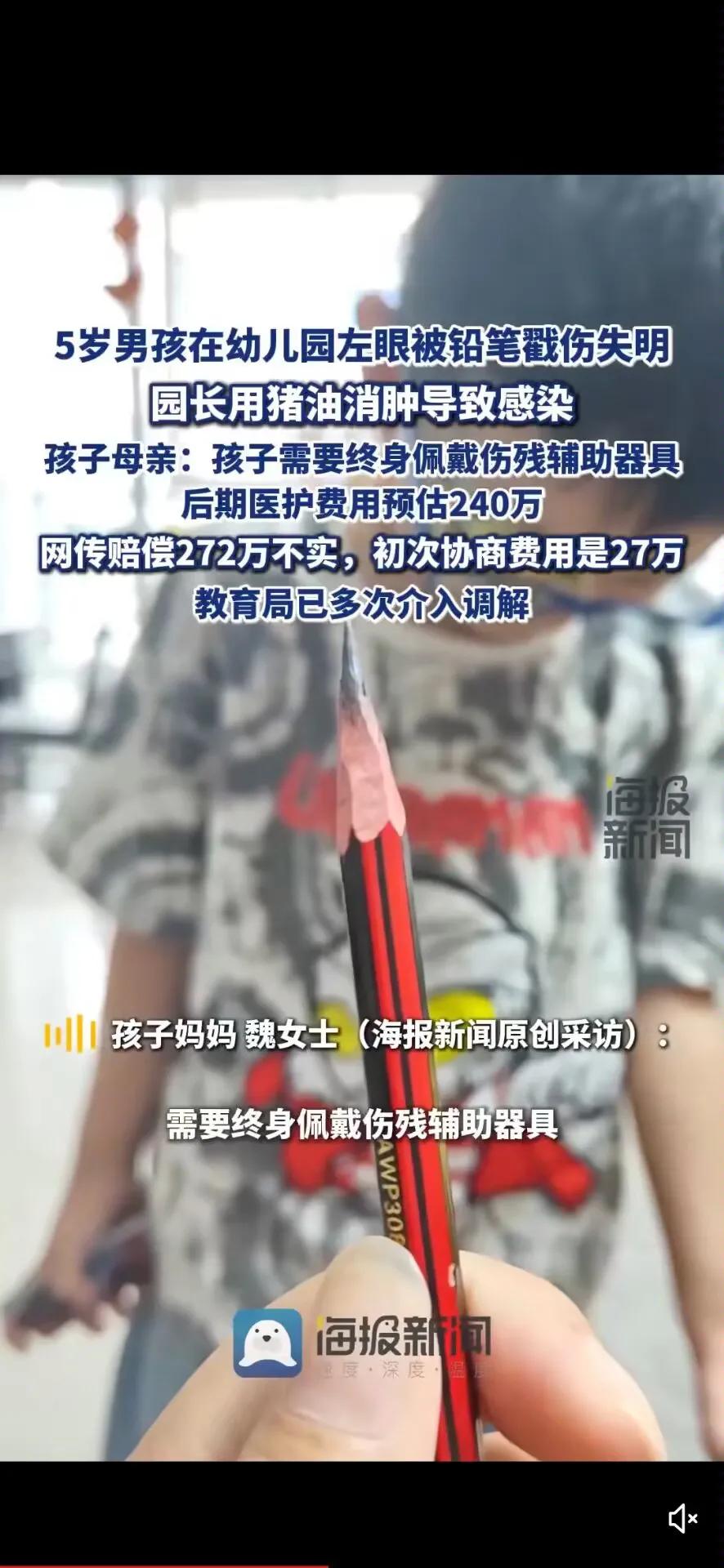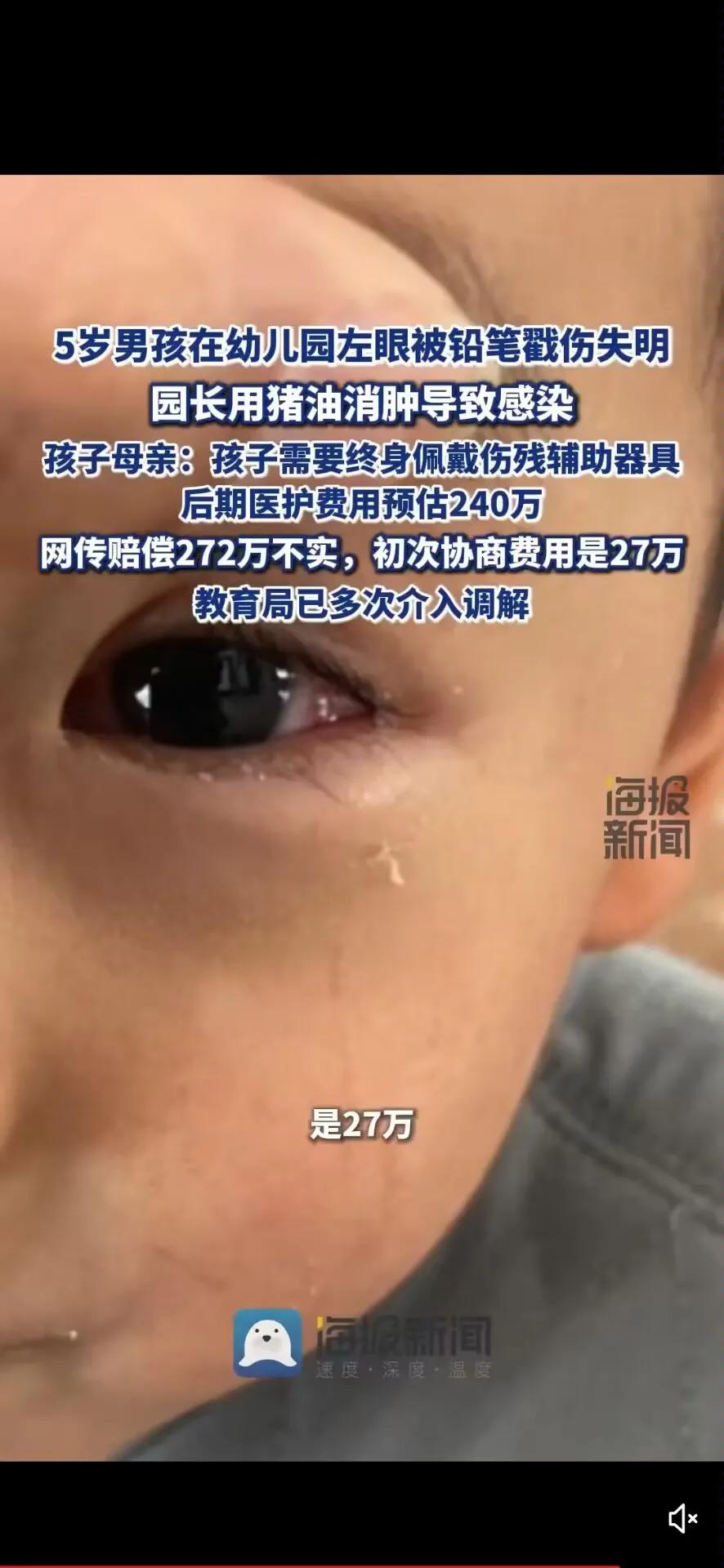 猪油糊眼能消肿?5岁娃眼球被戳毁,谁之过? 老师强调只是被铅笔划了一下,幼儿园的土法急救措施更是火上浇油!江西瑞昌一男孩眼睛被戳伤后,园长竟用猪油涂抹消肿,耽误送医导致其左眼失明。诊断书显示孩子眼角膜,晶体全破裂,终身需残疾辅助器,240万天价的后续医疗费压垮全家。 令人气愤的是,老师连连隐瞒。没事,就划了一下!家长接娃时被误导,直至送医才知真相。网传272万赔偿实为27万,教育局调解无果,家长决心法庭见。 就这认知和资质居然能办幼儿园?园方急救无知,管理失责,必须严惩!孩子太小,不懂自己伤情的严重性,也表达不清楚。土法有用?那也得分什么情况什么人是不是?开头就错,然后步步错,他还那么小,一个孩子一半的光明世界,就这么被毁了!土法不是罪,无知才是!