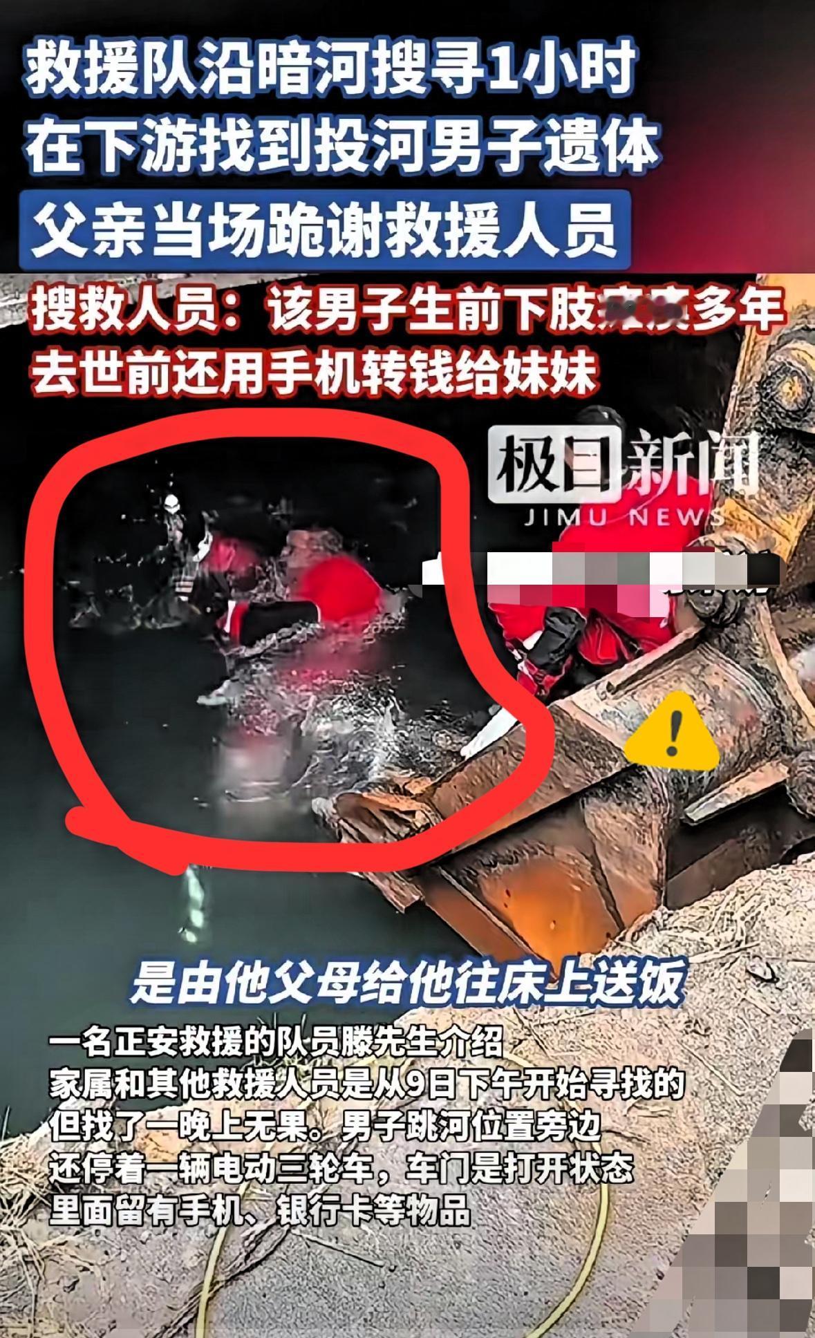 济南下肢瘫痪,生活不能自理的男子投河自尽,他临走前把手机里的钱都转给了妹妹,把银行卡和手机放在了河边。 谁能想到,一个连饭都要父母端到床上的瘫痪男人,最后能做的“孝顺”,竟是悄悄把手机里的钱全转给妹妹,再把银行卡和手机摆好,独自走向冰冷的河水? 邻居说他以前还能拄拐挪两步,可后来越来越重,日子久了,他眼里的光慢慢没了。我们总说父母不会嫌孩子麻烦,可对他来说,看着年迈的父母日复一日伺候自己,这份愧疚早压得他喘不过气。他不是不爱,是太怕自己的“活着”,成了父母的“累赘”。 这哪是放弃生命?分明是用最痛的方式,想还父母一个轻松点的晚年。只是他忘了,对爸妈来说,孩子在,家才在。 虽然同情,但是我们尊重他人的命运,他或许就是不想再让父母为他再辛苦了。如果还有来生,做个健全人,好好生活。一路走好!