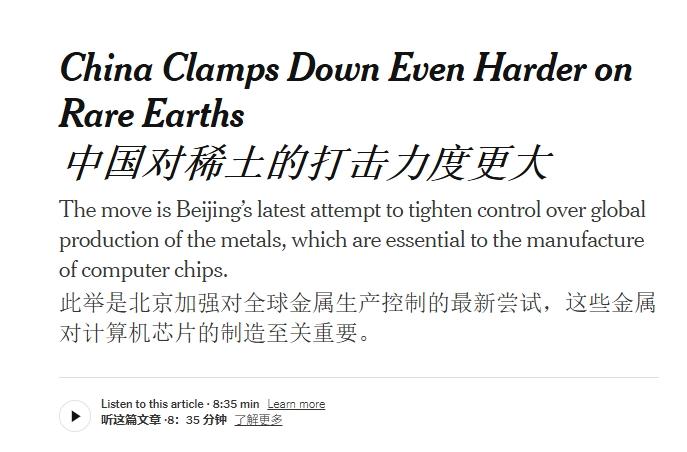 就在刚刚 美国方面正式承认:在中国严格的稀土管控下,美国可能买不到芯片了 10月10日,《纽约时报》说出了真相,它们认为,这次中国限制稀土的手段很高明,几乎是全产业链限制,从生产、加工和分离设备,在到相关原辅材料,中国都进行了条件限制,现在只要含有来自中国0.1%稀有金属分离技术,就得需经中国方面审核,许可后才能卖给美国。 而美国为此很有可能买不到芯片,因为很多芯片产品离不开中国稀土做原料,像英伟达的一款电容器,需要极难提纯的超纯镝制造,而全球的超纯镝都来自于无锡一家精炼厂。 记得30年前的瓦森纳协议么?当时42个欧美日韩国家对我们进行了技术围猎,就是不希望中国能够获得技术突破,美国直接设定了一个很无理的要求“只要各国生产的半导体芯片和其它产品有10%的美国技术,都需要美国许可才能售卖给中国”,当时对我们的打击可以说是空前的。 现在风水轮流转,只要有0.1%的中国稀土技术,必须要经过中国同意,才能售卖给美国,这并不是“报复”,而是我们崛起的信号。 接下来就看美国如何做出选择了,合则两利,斗则两败。