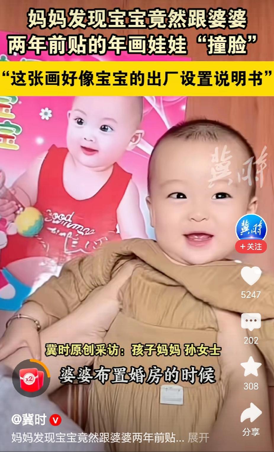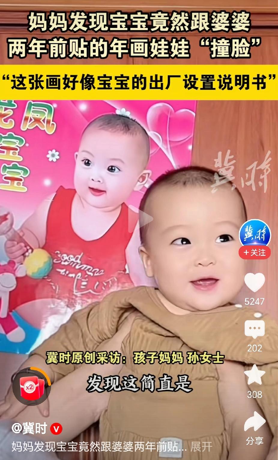 “神奇了,宝宝与婆婆贴的年画娃娃一模一样!”近日,河北孙女士发了一条视频,将自己