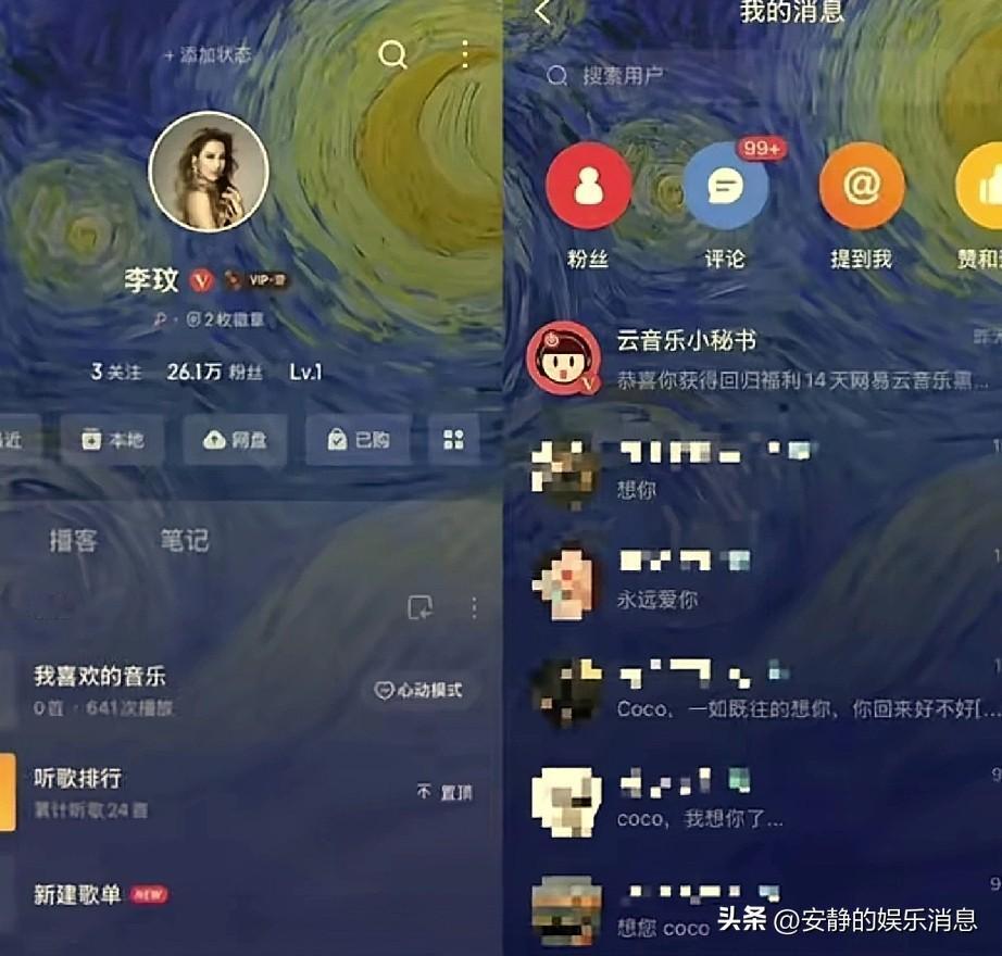“意外”+“泪目”。 有网友通过新手机号注册网易云音乐后发现登录了李玟官方认证账号,评论区都是悼念留言! 有网友注册网易云音乐时,意外的登录了李玟的官方认证账号,因为出于好奇,他并没有立刻登出,而是查看了一下这个账号。只见,这个账号一共有26.1万粉丝,歌单里全是李玟的经典歌曲,评论区也都是粉丝的悼念留言,“99+”条未读信息。 大多数都是粉丝说“我们永远爱你”“想你”等等。该网友表示,虽然自己不是李玟的粉丝,但被这些评论感动的不行。 随后,他将自己的发现发到了网上,引起众多网友围观和赞叹。没想到,网易云音乐也看到了他的帖子,并做出了官方回应。 确认此手机号是李玟绑定的手机号,被运营商二次放号了,导致新号主登录上的竟然是李玟的官方认证账号。网易云音乐也表示,已经与新号主取得了联系,并妥善处理此事。