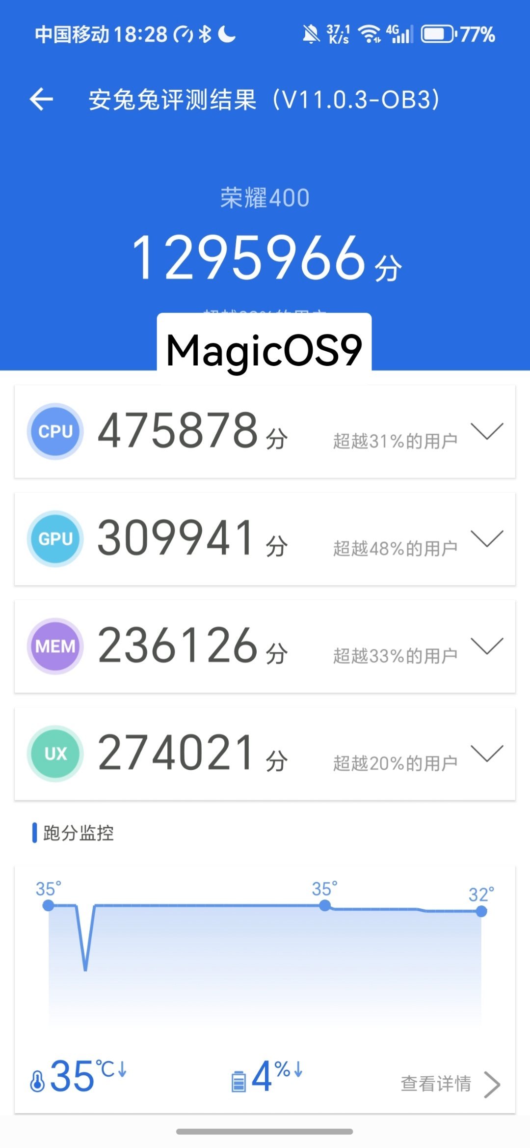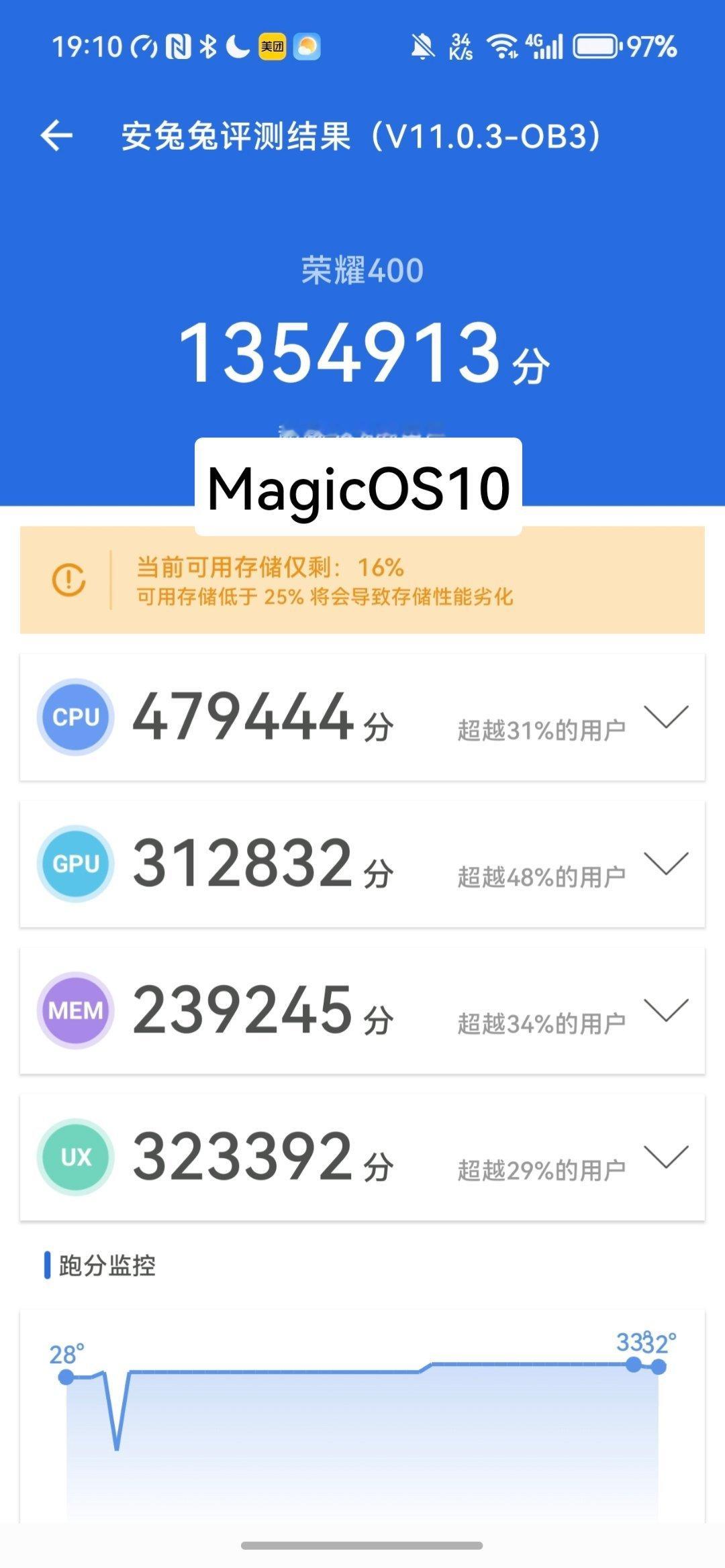 荣耀400标准版升级完MagicOS10后,安兔兔跑分还高了几万,主要提升在UX,也就是系统体验方面。