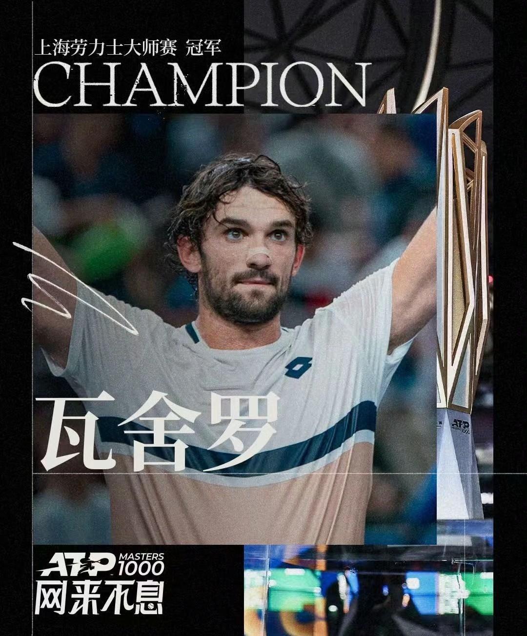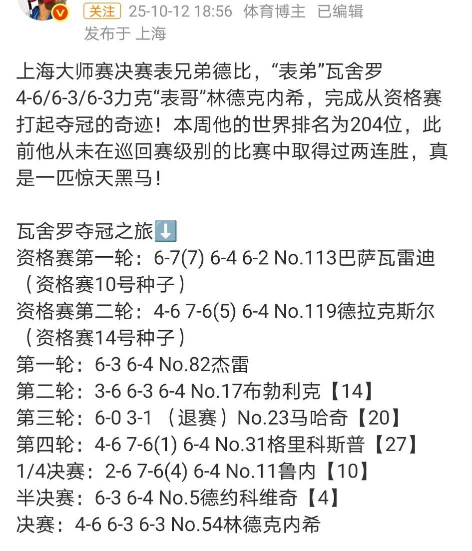 他真的创造了神话,一黑到底九连胜!从资格赛打起,从外场打起,一路打到中央球场夺冠,成为上海大师赛首个资格赛冠军选手! 表弟瓦舍罗4-6/6-3/6-3逆转表哥林德克内希。 真有点像赵心童世锦赛夺冠一样。