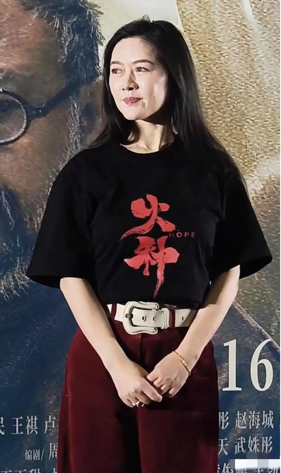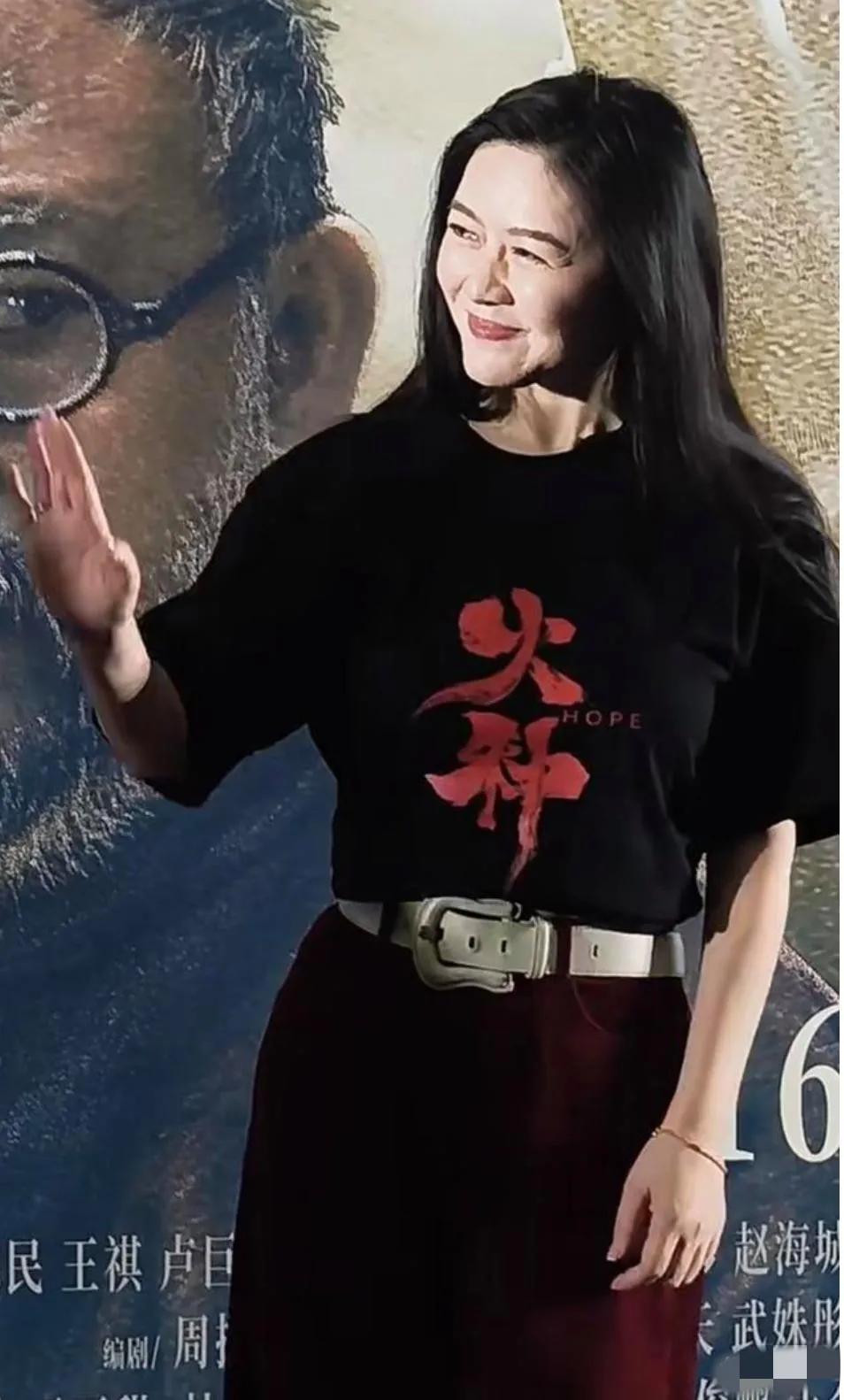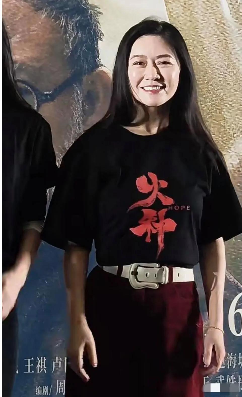 49岁的田海蓉出席电影《火种》首映礼:长发飘飘,胖瘦合度,面白脖黑,法令纹明显,