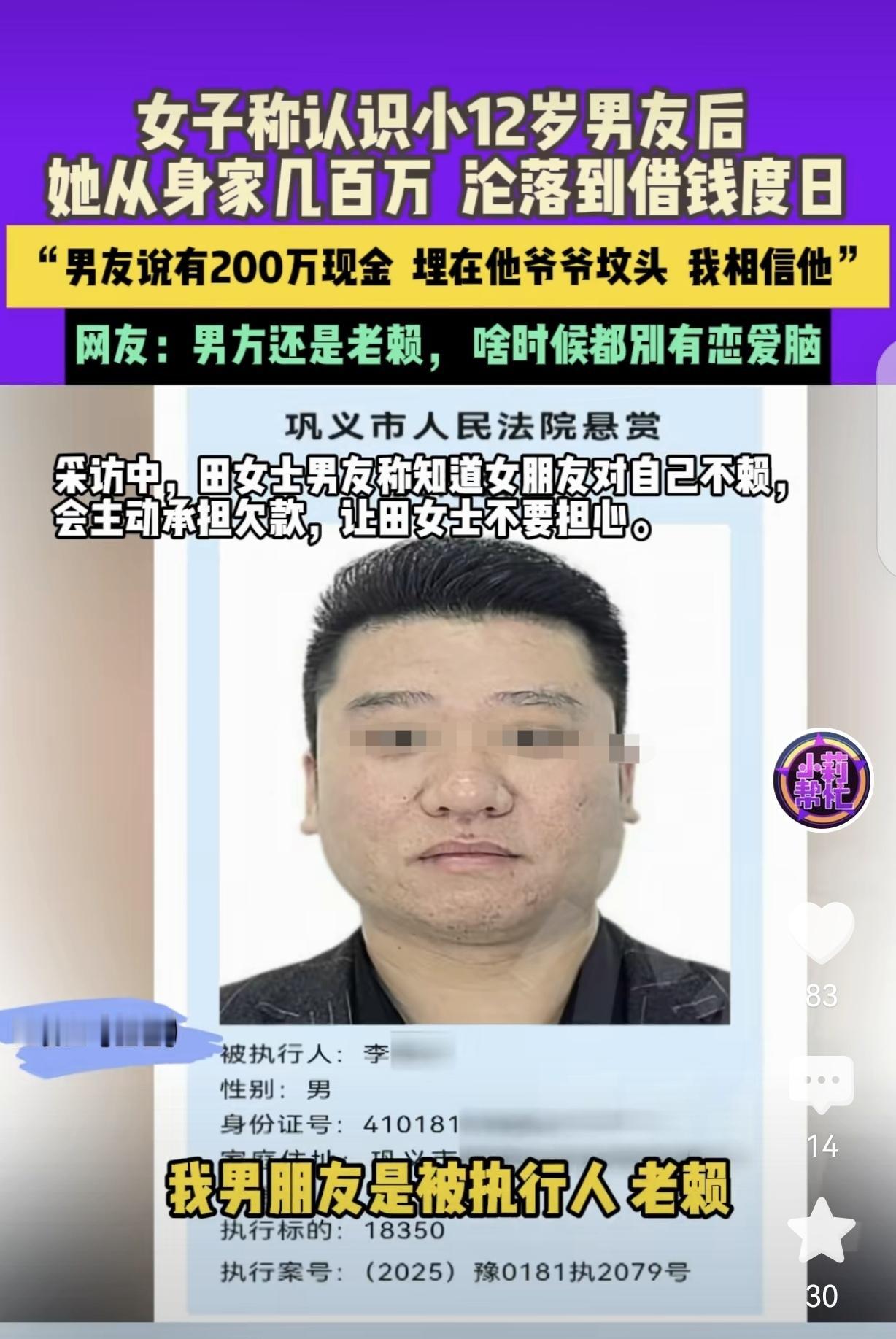 “这智商怎么挣得几百万?”河南巩义,一女子离异,认识小自己12岁的男友,某晚下半夜,男友把她领到爷爷的坟前,说里面埋了200万现金,以后都是她的。女子觉得瘆得慌,也没求证就信以为真,卖房子,借钱,贷款,陆续给了男友272万后,男友的身份让她捶胸顿足。网友:嫩草不好吃! 2023年,离异后的田女士认识了小自己12岁的男子,很快两个人就打的火热,一日不见如隔三秋,男子变成了她的男友。 按理说,田女士初婚失败,应该吃一堑长一智,找个年龄相仿的,能相濡以沫过一生的,可她还是个恋爱脑,很快在新感情里沦陷。 田女士不在乎别人说她老牛吃嫩草,虽然自己离婚了,跟小男友年龄差了一轮,但她觉得自己配的上小男友。 因为她身价百万,离婚后,名下有2套房子,一套自住,一套收租,既安居乐业,还有固定收入。 她还有一辆代步车,出行方便,而且还开着商店,虽然不是日进斗金,但每天都有源源不断的进账,同时兼做天然气的生意。 可以说,田女士吃喝不愁,财源广进,财务自由,这都是她的底气,别看她离婚了,但想再婚,得扒拉着男人挑,吃嫩草咋了?她有这个资格,她认为小男友爱她还高攀了呢。 关键是,田女士对这个小男友是欲罢不能,他嘴巴太甜了,跟抹了蜜一样,经常把她哄的笑口常开,围着她鞍前马后,也对她嘘寒问暖,无微不至。 如胶似漆几天后,小男友突然告诉田女士,他接触到一个项目,只需要投10几万,每天却可以挣两三千,这么挣钱的买卖,过了这村没这店了,千载难逢呀! 田女士一直经商,投资小回报高的项目她觉得不靠谱,对小男友的话将信将疑,可架不住小男友巧舌如簧,而且,她又不差钱,她还是选择对男友言听计从。 万万没想到,田女士投资后没几天,男友竟然给了她五六万,说是利润,田女士惊讶不已,不可置信,还真是投资少回报大,而且周期短呀! 小男友借着又撺掇她加大投资,田女士这回深信不疑,4个月的时间累计投资80万。 结果大家应该猜到了,那就是本利一分钱没收回来,男友也不知去向。 田女士急了,她再有钱,80万也不是个小数目,她费劲巴拉联系上小男友。 小男友却说,自己把租的车抵押了,被租车行起诉诈骗,他很快就要锒铛入狱,如果田女士不施与援手,她的80万投资,也会血本无归。 田女士脑袋瓜子嗡嗡的,她快速算了一笔账,她如果不把男友捞出来,80万就打了水漂了,她不能容忍这样的事发生。 于是,田女士赶紧卖房卖车,钱不够堵男友的窟窿,她又四处求借,贷款,又帮小男友还了45万外债。 田女士之所以这么倾其所有,可没脑子进水,因为有一天后半夜,小男友把她领到爷爷的坟头,说里面埋着200万现金,只不过如今不是见光的时候,等取出来,都是田女士的。 不料,田女士信以为真,可她并没有去求证,一是她相信小男友的鬼话,二是大半夜的,她觉得瘆得慌,想赶紧离开。 结果就是,一开始投资的80万没见到影子,她又卖房卖车,举债贷款投了200多万,最终换来的却是小男友给她打的272万的欠条。 田女士握着欠条,却找不到小男友了,那欠条不就成了一张没用的白纸了吗?这时的她,终于意识到了不对头,眼瞅着要人财两空了,她慌了神,赶紧求助媒体。 当着记者的面,田女士终于电话联系上了小男友,可对方承认这笔272万的欠款,承诺一定还给田女士。 但小男友矢口否认他爷爷坟里埋着200万,说他压根没说过这话,是张女士胡说八道,异想天开,然后不耐烦的挂断电话。 而男友母亲却说,这是他们的家务事,媒体不该插手。 田女士瞬间傻眼了,小男友否认自己说过的话,又开了空头支票,终于把她惊醒了,她知道自己上当受骗了。 田女士赶紧报了警,可帽子叔叔的话,让她一下子心凉半截,她这才知道,男友是被执行的老赖! 田女士欲哭无泪!她竟然被小12岁的男友忽悠的晕头转向,倾家荡产,以前要车有车,要房有房,如今却一穷二白,债台高筑! 《刑法》第266条规定:诈骗公私财物,数额特别巨大或者有其他特别严重情节的,处十年以上有期徒刑或者无期徒刑,并罚金或者没收财产。 田女士的男友以虚构高收益投资项目、编造“爷爷坟内埋有200万现金”等谎言,诱骗其先后投入272万元,且未归还分文。其行为符合诈骗罪构成要件: 《民法典》第148条规定:一方以欺诈手段,使对方在违背真实意思的情况下实施的民事法律行为,受欺诈方有权请求人民法院或者仲裁机构予以撤销。 田女士因受男友欺诈而实施的卖房、借贷、转账等民事行为,可依据该条款主张撤销: 男友虚构投资回报、编造“坟内现金”等谎言,构成典型欺诈行为。 田女士因欺诈产生“投资可获利”“后续有保障”的错误认知,导致其错误处分财产。 田女士可主张撤销基于欺诈签订的借款合同、欠条等法律行为,并追回损失。 关注@灋律盐究员 学法辩是非,用法止纷争。