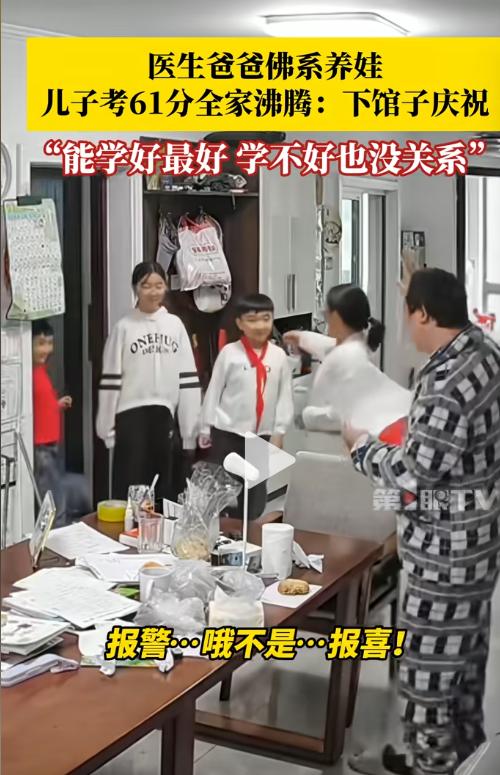 光宗耀祖了!安徽,一位妈妈跟老公报喜儿子考了61分终于及格了,爸爸一激动差点要跟爷爷奶奶打电话报警,兴奋的要下馆子庆祝。 爸爸正躺在沙发看电视,妈妈挥舞着试卷从门外走进来,脸上洋溢的笑容对着老公说:梁医生,你家祖坟冒青烟啦~你家孩子考了61分! 老爸一激动,一下子从沙发上跳起来,激动的说到:赶紧,赶紧给你爷爷奶奶打电话。甚至嘴瓢把“报喜”说成了“报警”~ 听到老爸如此激动,全家人都笑开了花,妈妈洁白的大牙都笑得格外灿烂。爸爸大手一挥,扬言今天要下馆子庆祝一下~ 这么有爱的视频很快就被网友刷爆。 这位爸爸是位医生,在医院看过太多的生离死别,所以对孩子的成绩一直比较佛系,孩子一直考试没有及格过,突然间孩子能够进步突破60分,全家都给予孩子最真诚的鼓励。 现在很多家长都对孩子的学业抓的很紧,各种辅导班培训班,很多孩子因为压力过大也容易有心理问题。所以应该很多人在看到这样和谐的家氛围肯定也是很羡慕的。 人生不是一场标准化考试,健康的人格、积极的心态和感受幸福的能力,才是孩子未来行走世间的根本。有时候,父母的“佛系”不是放任,而是一种更高级的守望。 虽然孩子考的只有61分,远远没有100分的完美,但父母眼里看到的却是孩子每一次进步的突破,这种鼓励才是未来孩子在面对困境和人生时候最重要的东西。 我相信这种不被分数绑架的教育才是所有家庭需要学习的,你觉得呢?