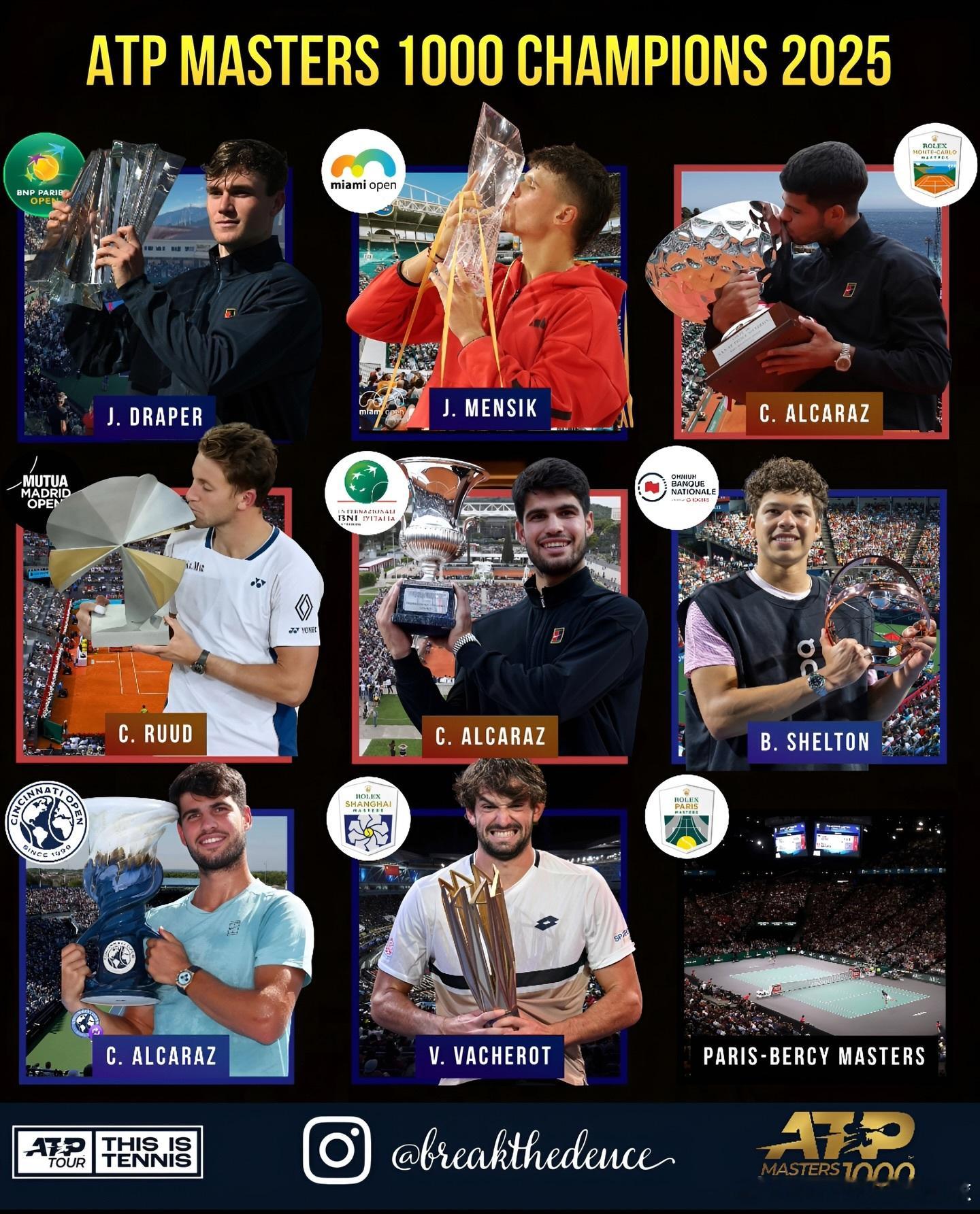 2025大师赛和WTA1000赛事冠军🏆一览除了男子的巴黎大师赛,其他冠军都已