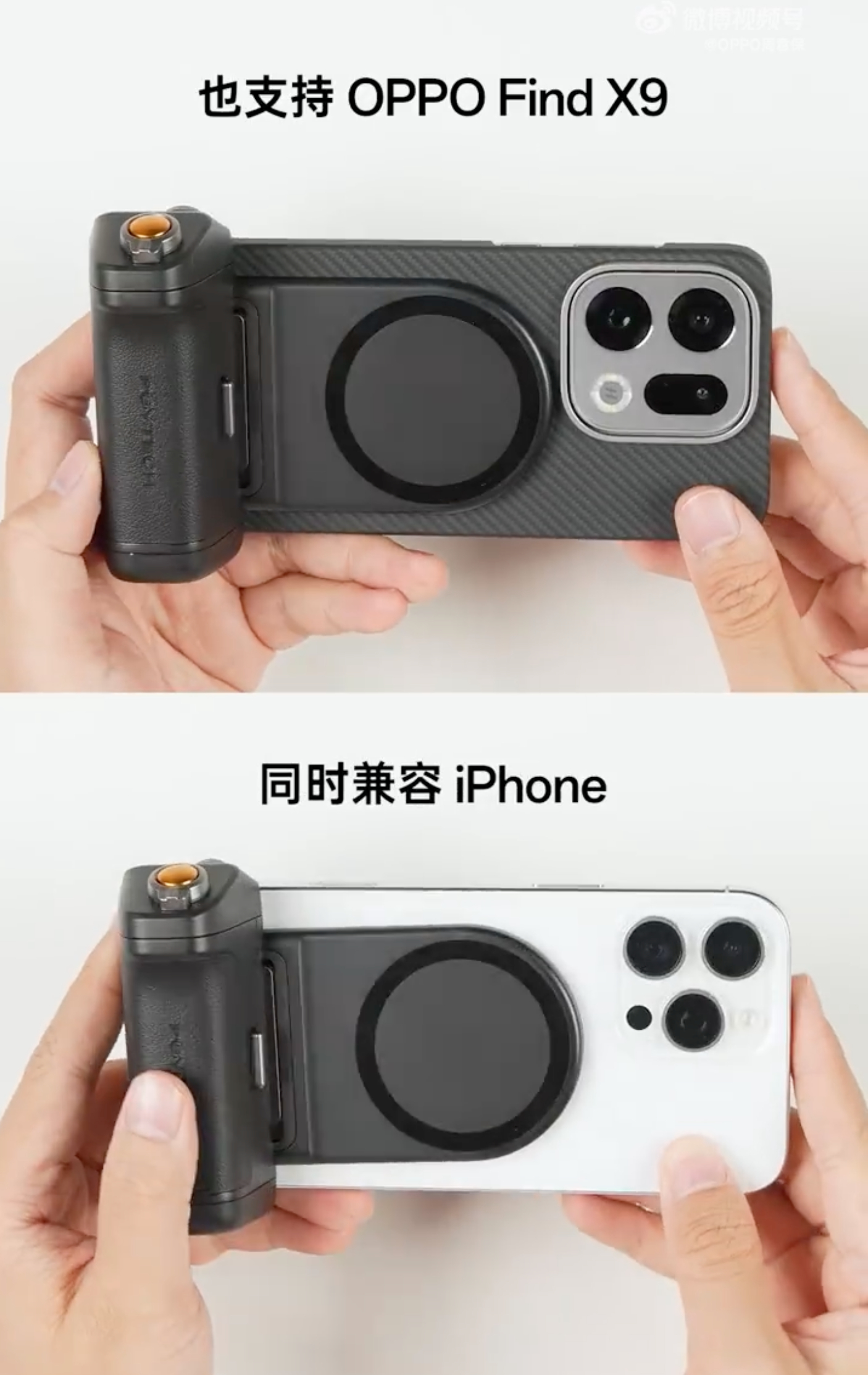 一方面壳子看着很薄,另一个是手柄用的磁吸的方式装配,拆装都会更方便。而且这次套装支持X9系列还支持iPhone,磁吸真好啊。