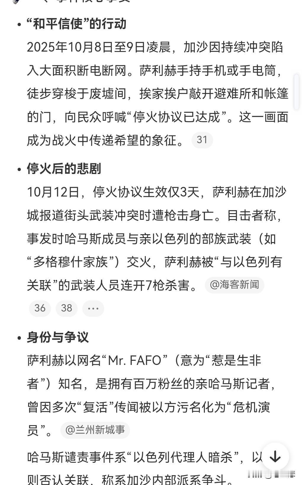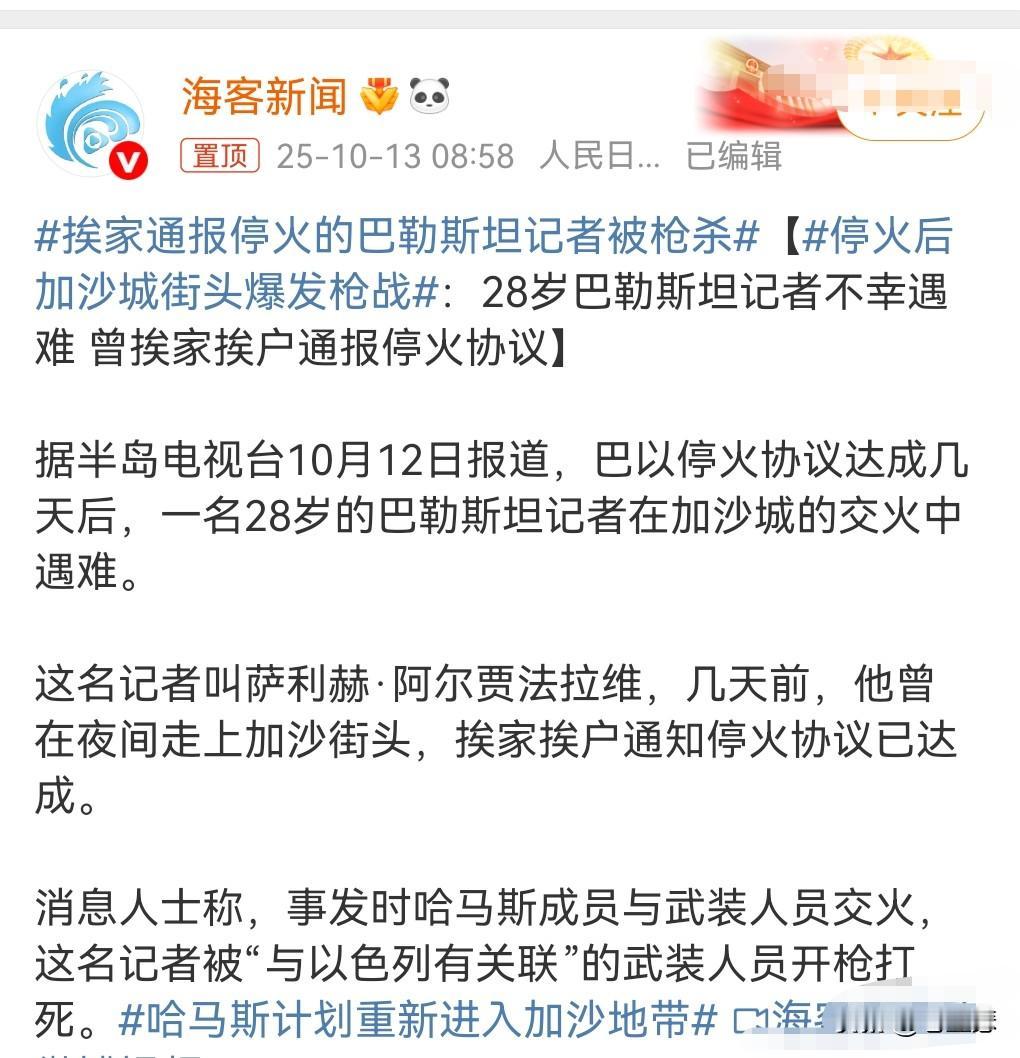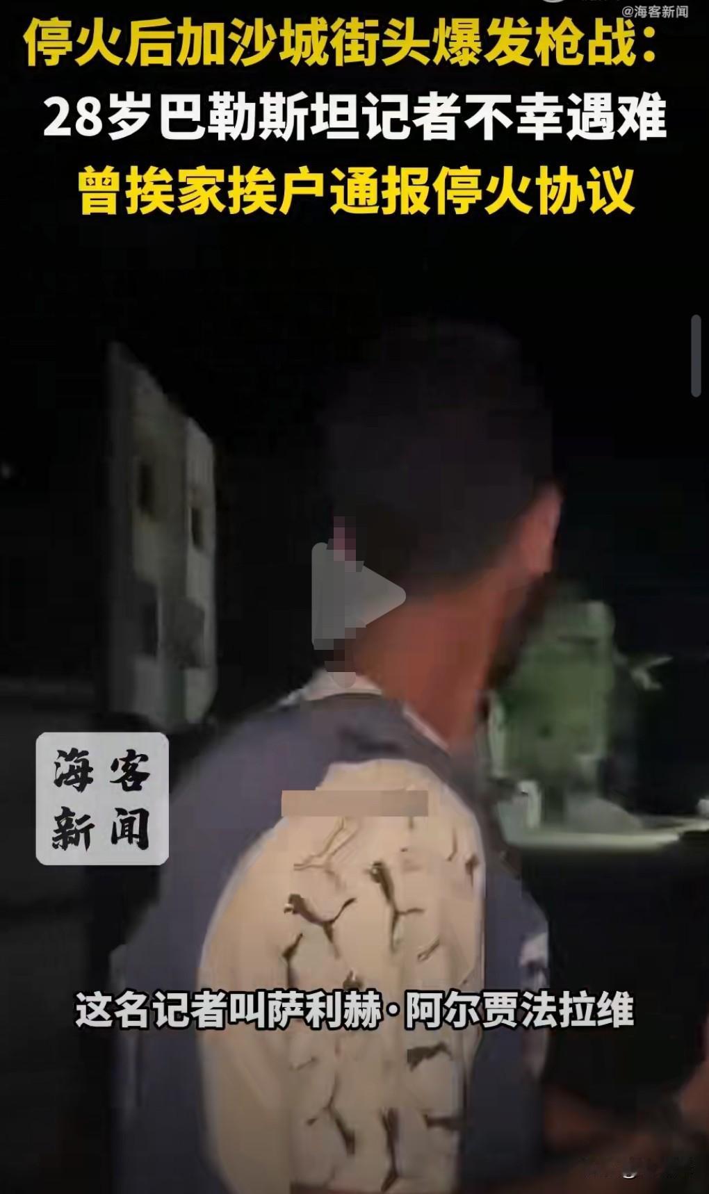 这真的是太悲剧了,人生无常。 何况是加沙这种危险的地方。 此前一名28岁的巴勒斯坦记者,挨家挨户加沙通知停火协议。 没想到几天后传来不幸的消息,哈马斯与武装人员交火。 有人称这名记者被与以色列有关的武装人员开枪打死。 这真的是太不幸了。 加沙的乱局何时才能停止?