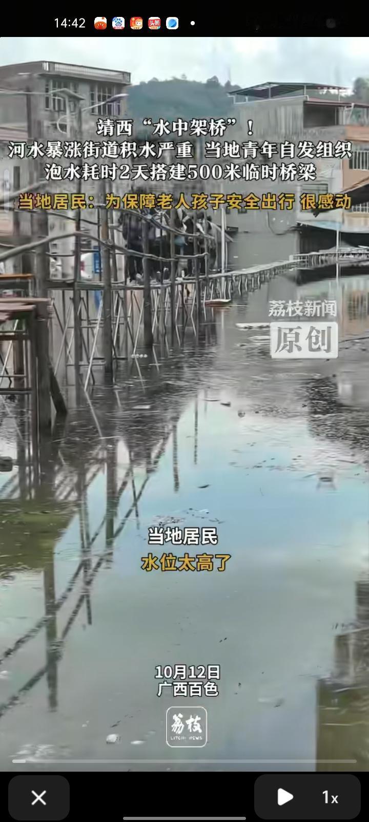 10月12日,百色靖西市。因河水暴涨导致街道积水严重,老人小孩过不去,一群青年自发组织在水里架桥,耗时两天建成,桥长度有500米,孩子们顺利通过桥梁上学。 靖西当地青年自发组织耗时2天水中架桥