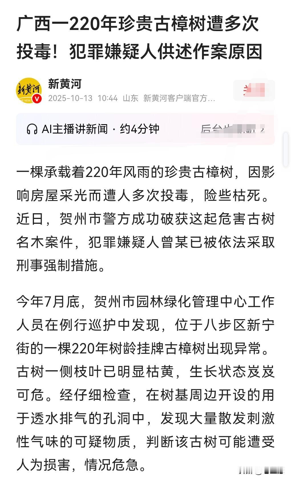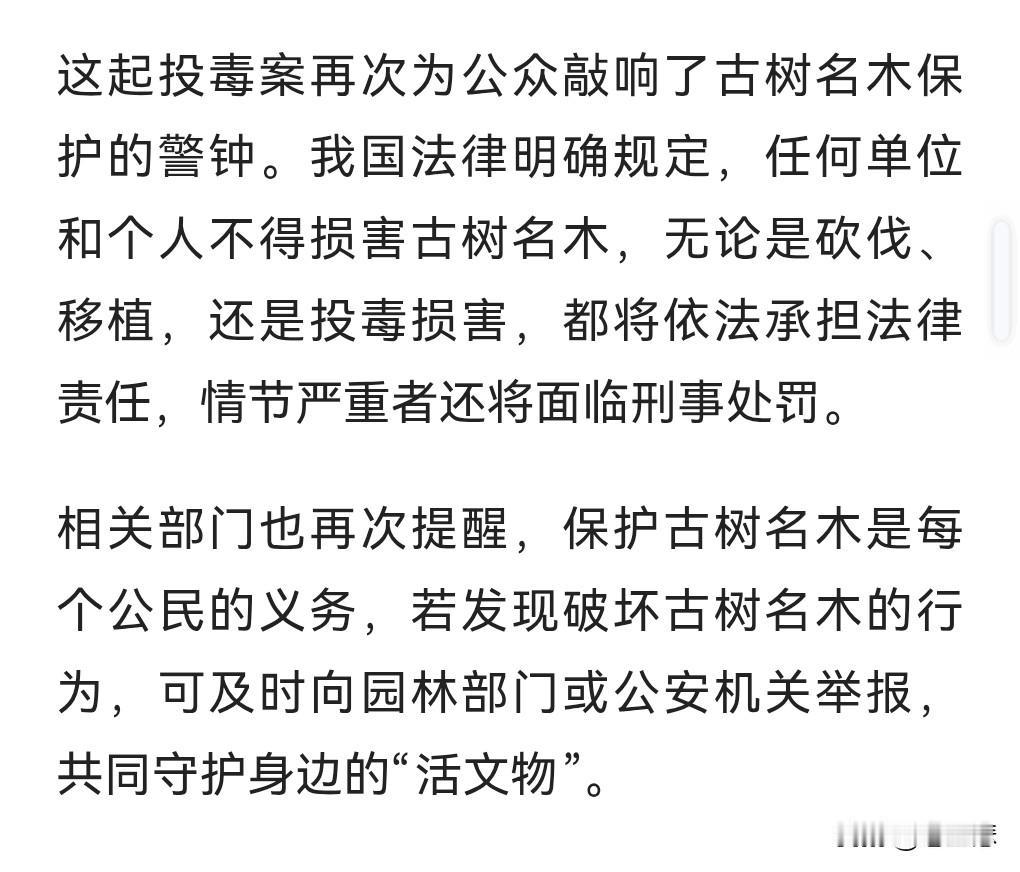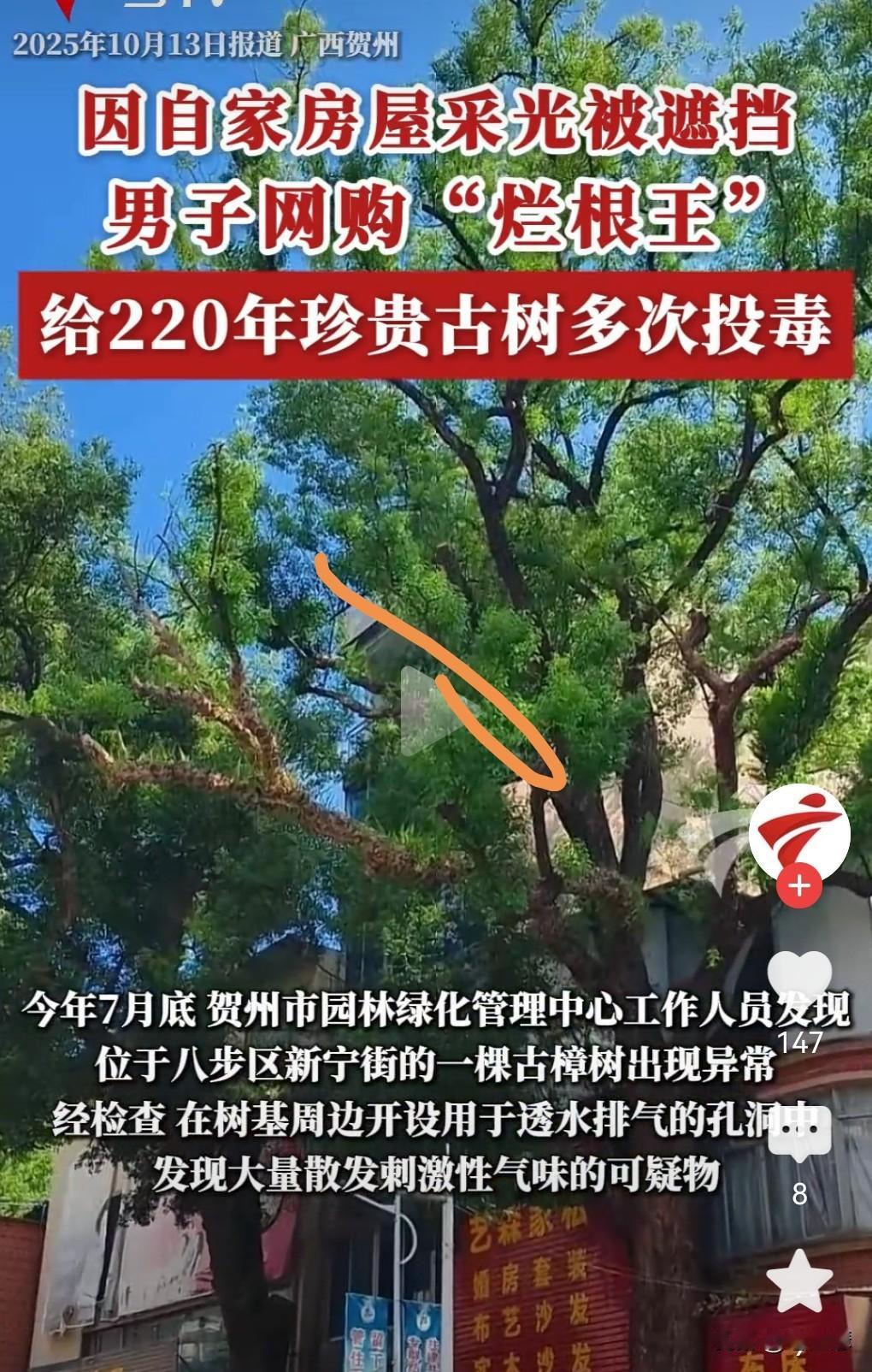 这实在是太恶劣了,竟然对一棵树龄220年的树多次投毒,差点把树给弄死。 像这么多年的树,可以说是一种文物。 这个男子真的是太不计后果了,而他这么做的原因竟然是嫌古树挡光。 目前男子已被刑事拘留。 经过挽救。这棵树停止了枯萎,正向好的方向发展。 此案也敲响了警钟,不可随意损害古树。