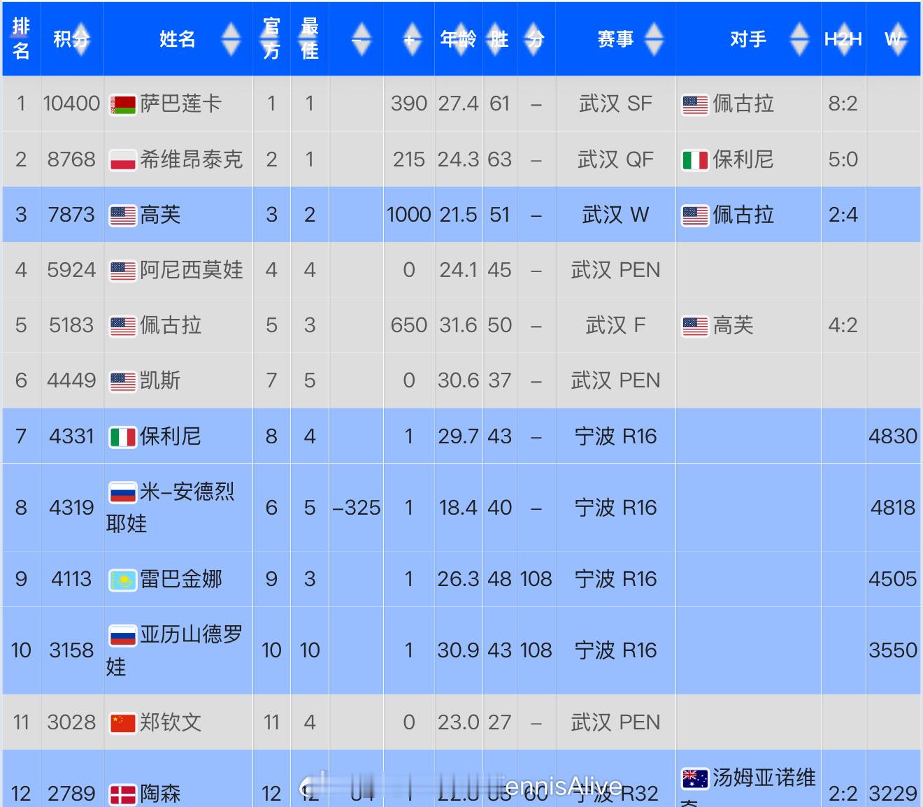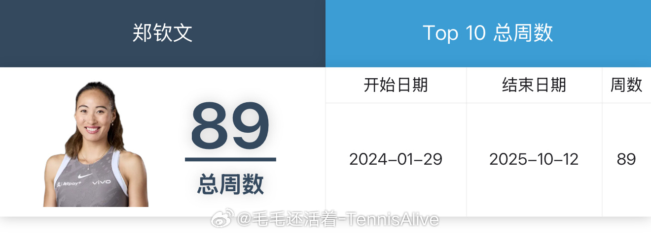 本周郑钦文的排名掉出前十,来到11位。她在2024年1月29号开始的世界前10周数戛然而止。不知不觉钦文已经在世界前十89周了。因为伤病原因提前结束本赛季。现在大家期待的是更健康的郑钦文,仅此而已。