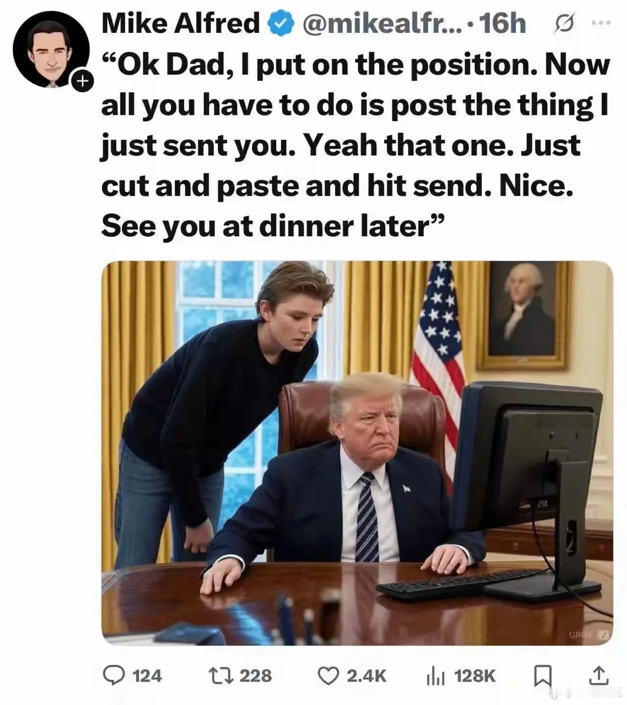 特朗普小儿子靠加密市场赚8000万美金的报道,再看英文区那梗图,我直接笑不出来了——这哪是“赚钱容易”,分明是把“权力变现”玩成了明牌,普通人连门都摸不到。 梗图说“没天赋没算法,提前建仓让爹发推特就行”,这话听着像调侃,细想全是讽刺。咱们炒币得盯K线、赌行情,输了血本无归,他倒好,爹的一条推特就是涨跌开关,8000万跟捡来似的。