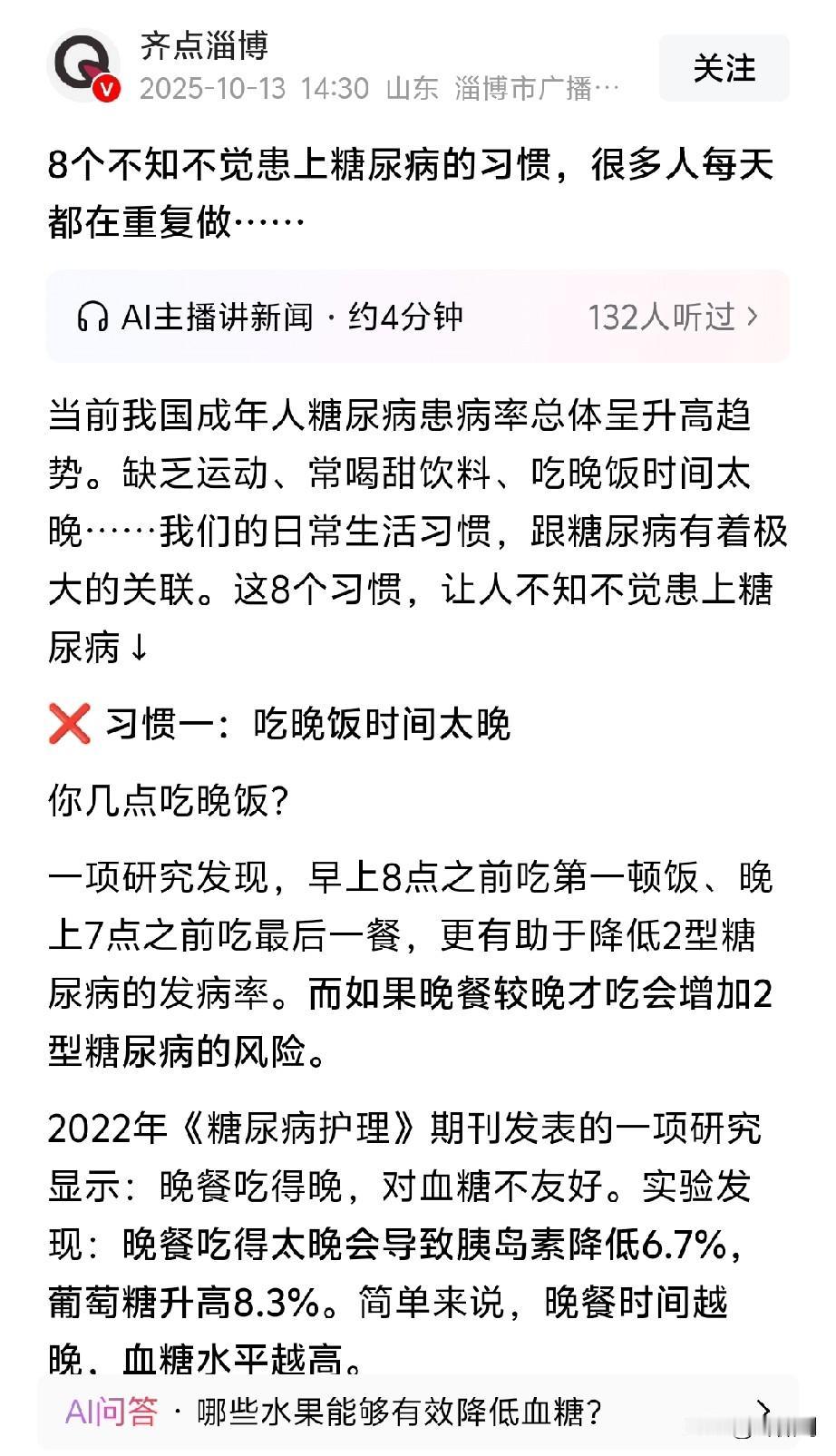 八个习惯不知不觉患上糖尿病,很多天每天重复。 1,吃饭太晚。2,吃红肉“牛羊肉猪肉”。 3,喝酒。4,喝甜味饮料。5,开夜灯睡觉。6,经常久坐。7,睡眠不足。8,不怎么运动。 我个人表示怀疑,因为这些习惯我都有,但暂时没有糖尿病。 我朋友跟我同龄,经常跑步,休息规律,平时爱吃肉,比我注重多了,但他已经糖尿病很多年了。 而且最近几年,糖尿病好像趋于年轻化了,我们身边就有好几个三十多岁,正年轻力壮的都糖尿病了。 我个人认为,糖尿病风险的提高,不只有这八个原因,而且风险最高的原因,应该没找出来。 我猜测,有某一种伤害我们胰腺的添加剂,有可能就藏身在我们身边。