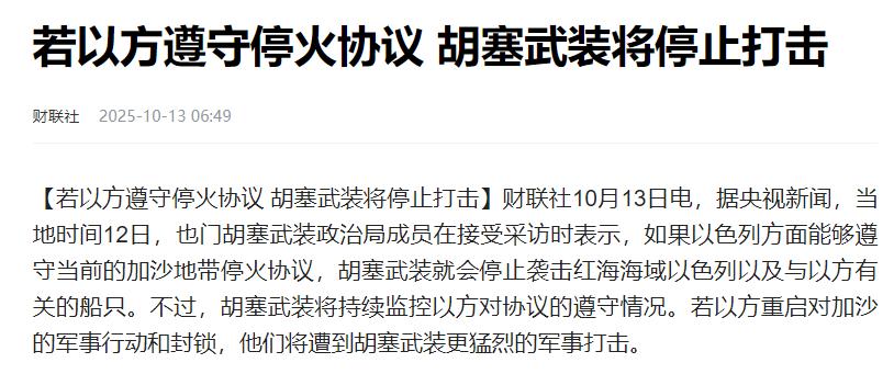万万没想到啊,胡塞武装竟然说到做到! 就在以色列总理内塔尼亚胡宣布和哈马斯达成第一阶段停火协议后,也门胡塞武装很快也跟着宣布,会停止对以色列本土以及红海商船的袭击。 要知道,胡塞武装是也门北部的一支主要武装力量,一直以来都以反对以色列霸权为立场。自从2023年巴以冲突升级后,他们就没闲着,用无人机和导弹对以色列发动了上千次袭击,还在红海搞起了“航行禁令”。 这一举措直接打乱了全球航运节奏,全球12%的贸易货物都被迫绕走好望角,航运成本一下子涨了4倍多。 而这次宣布停火,胡塞武装说得很清楚,行动完全跟着加沙停火协议走——要是以色列能全面撤军、释放人质,还解除对加沙的封锁,红海就能一直保持平静;可要是以色列不守信用,他们肯定会重新发动攻击,给以色列来个措手不及。 这种“以停火换和平”的做法,既兑现了对巴勒斯坦的支持承诺,也给自己争取到了调整的时间。 而且,胡塞的停火可不是随便一说,他们领导人阿卜杜勒·马利克·胡塞在电视讲话里强调,会通过多种方式密切关注协议执行情况,像国际援助物资能不能顺利进入加沙、人质有没有按时释放这些关键问题,都会一一核查。 这种细致的安排,既能避免因为误会引发冲突升级,也能通过舆论压力逼着以色列兑现承诺。 另外,胡塞还公布了过去两年的作战数据,说一共发动了1835次打击,用到了弹道导弹、巡航导弹、高超音速导弹等不少武器,这既是展示自己的军事实力,也是在提醒各方“我们随时能重启行动”。 停火消息一出来,对全球供应链的影响马上就显现了。不少国际航运公司就赶紧恢复了红海航线,亚欧之间的货运成本当天就下降了12%。 不过航运业要完全恢复过来还得等段时间,毕竟之前因为绕行积累的货物有几百万吨,苏伊士运河的通行量比冲突前还少了72%。 更重要的是,这次事件还改变了地区地缘格局,胡塞武装从之前的“地区武装”一下子成了影响中东秩序的重要角色,他们和伊朗、黎巴嫩真主党形成的“抵抗轴心”,现在成了牵制以色列的关键力量。 但话说回来,这份停火协议其实挺脆弱的。翻看历史就知道,胡塞之前和也门政府、沙特等签过好几次停火协议,可最后没遵守的情况占了七成。 这次协议执行期间,以色列还在加沙边境留着军队,也没说清楚永久停火的期限,若是以色列不放弃占领加沙,那么战火依旧会再次点燃。 就像胡塞在停火声明里说的那样:“和平的钥匙在以色列手里。” 而在这场没有硝烟的较量中,哪怕一点小失误,都可能让局势再次陷入血雨腥风。