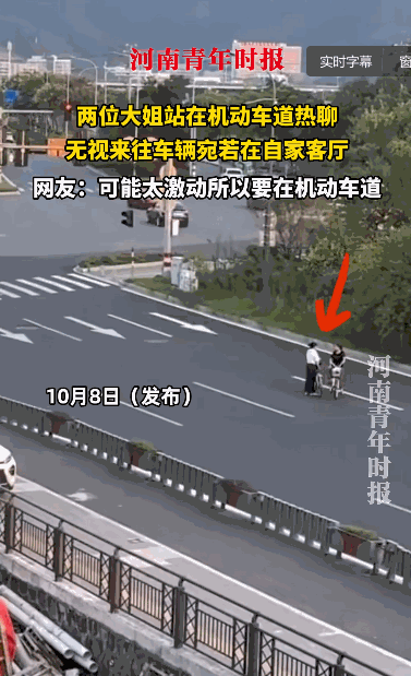 这是无知还是愚蠢?两女子站在机动车道中间,旁若无人地聊天,不知她们是怎么活这么久的,一把年纪了却没有一点安全意识,视生命如儿戏! 麻烦看官们右上角点击一下“ 关注”,既方便您进行讨论和分享,又能给您带来不一样的参与感,感谢您的支持! 10月8号,法治进行时报道了机动车道上发生的离谱事件。 两个女子推着自行车,旁若无人的在大马路上聊起了天,仿佛机动车道是自家客厅,不管旁边过了多少车辆,她们都稳如泰山,一动不动,寸土不让! 那天的画面真是让人哭笑不得,烈日下的马路上,车流像潮水一样涌动,发动机的轰鸣声、喇叭声此起彼伏。 就在这样一条四车道的大路中央,两位大姐竟然悠然自得地聊起天来,一个拎着菜篮子骑着车,一个也骑着自行车,就那么站在快车道上,神情轻松,仿佛世界只剩下她们俩。 周围的车辆一阵阵减速、变道、绕行,有司机急得直按喇叭,喇叭声几乎能震碎耳膜,但两位当事人却完全不为所动。 她们微笑着、比划着,聊得热火朝天,神态里写满了事不关己。 有网友看到忍不住嘀咕一句,这是真把马路当客厅了吧?的确,这一幕要不是亲眼看到,真以为是段子。 可偏偏这荒唐的现实,就这么发生在光天化日之下,让人不禁想问,她们活了这么多年,到底是靠什么?运气?天命?还是旁人无数次刹车的仁慈? 说句扎心的话,这不是勇敢,这是拿命开玩笑,机动车道是留给汽车跑的,不是闲聊区、不是散步道,更不是情感联络中心。 哪怕只站一分钟,风险都可能以秒为单位放大,稍有不慎,一个车主反应慢半拍,悲剧就可能当场发生。 别说谁撞了谁,到那时不管司机有没有责任,内心的阴影怕是一辈子都抹不掉,而她们可能连“对不起”都来不及说出口。 更荒诞的是,这种现象还不是个例,很多司机都有类似的经历:有人在红绿灯口拍抖音,有人骑着电动车边走边刷消息,还有人干脆在人行道与机动车道之间来回穿行。 似乎马路上的规则只是摆设,大家都心安理得地当特例,也许在他们眼里,危险只是别人家的事,事故永远不会轮到自己。 可现实从不会手下留情,新闻里那些“没想到”、“来不及”、“太突然”,背后往往藏着的就是这样的无知与侥幸。 理解她们想聊几句的心情并不难,许多人见到老朋友,难免兴奋,几句话没讲完就忍不住停下来寒暄,可问题是,地点选得太离谱了。 大街上、快车道中间,这哪是聊天的地方?这不是打招呼,这是给自己设陷阱。 每次看到类似新闻,评论区总是一片唏嘘,有人骂活该,有人叹可惜,也有人调侃命大,可想想看,如果所有人都带着这样的心态,事故又怎么可能减少? 文明的养成不在于口号,而在于每一次自觉的克制,遵守规则不是给别人方便,而是给自己留条命。 这不是苛责,而是一句真心话:无知可以原谅,愚蠢却太贵!对此,大家在马路上还见过什么离谱的事情?欢迎在评论区聊聊。