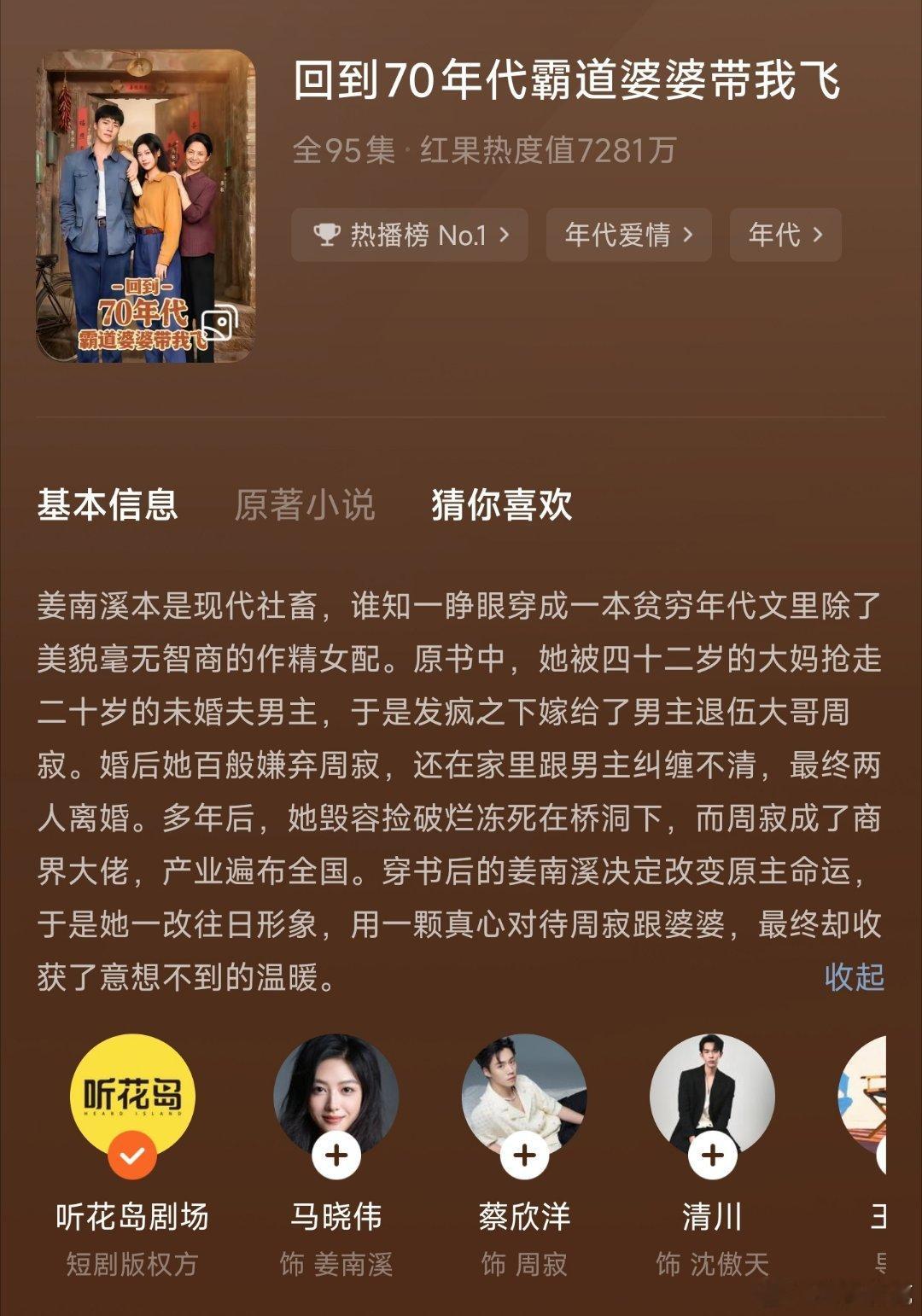 听花岛新剧《回到70年代霸道婆婆带我飞》播得不错,我看红果热度登顶了。他家之前老有人吐槽滤镜、原声,这部真不一样,听话了,本子、镜头、滤镜、原声都不错,有质感也有笑料,我一口气看完了。