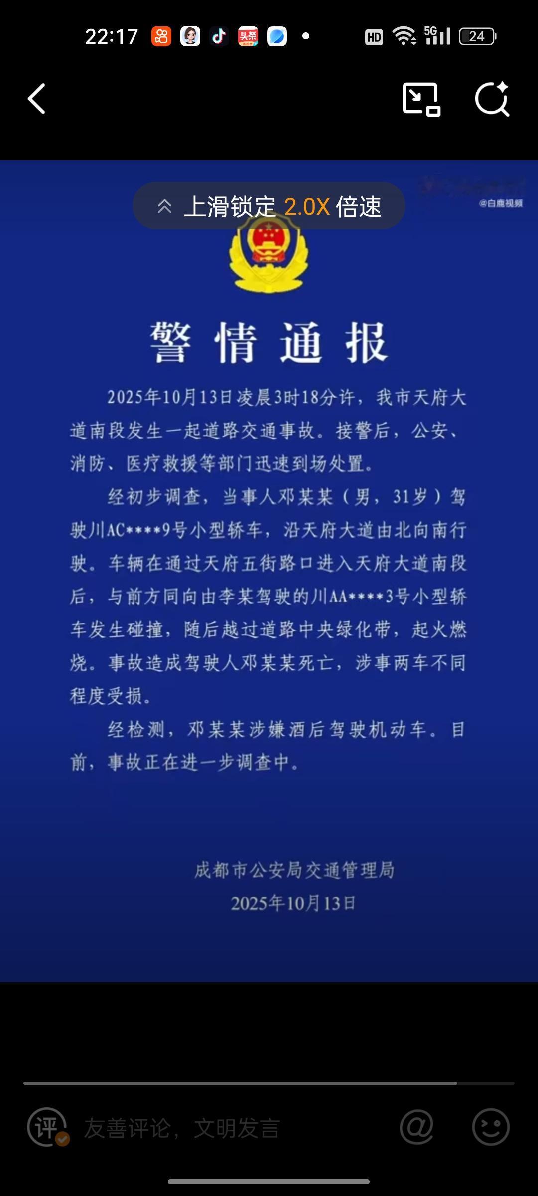凌晨3点的火光:天府大道车祸背后,藏着多少人忽略的生死瞬间 2025年10月13日凌晨3时18分,成都天府大道南段的夜色本该是沉睡的。可一声剧烈的碰撞,划破了凌晨的寂静——两辆车的撞击声、随后燃起的熊熊火光,在监控画面里刺眼得让人心颤。 当消防队员顶着高温扑灭火焰,当医护人员带着急救箱冲向现场,所有人都在祈祷能有生机。可最终传来的消息,还是让人忍不住叹气:31岁的邓某某,永远停在了这个凌晨。他驾驶的小车越过绿化带燃烧的画面,成了这个秋天最让人揪心的一幕。 我们总在说“喝酒不开车”,可总有人觉得“就喝了一点没事”“凌晨路上没人”。邓某某不会想到,一次侥幸的酒后驾驶,不仅让自己的生命戛然而止,更给两个家庭留下了无法愈合的伤口。他的父母可能还在等他回家,他的朋友或许还约好了下次相聚,可这场事故,把所有未来都烧成了灰烬。 再看另一辆车上的李某,凌晨出行或许是为了工作,或许是为了急事,却无端被卷进这场灾难。看着自己的车被撞得面目全非,看着旁边燃烧的车辆和逝去的生命,他心里的恐惧与后怕,恐怕很久都难以平复。这世间最无辜的,莫过于被他人的疏忽牵连,平白经历一场生死考验。 事故通报里的“涉嫌酒后驾驶”,短短六个字,背后是无数血淋淋的教训。我们总以为“意外离自己很远”,可当侥幸战胜理智的那一刻,危险就已经在眼前。每个深夜在酒局上劝酒的人,每个觉得“少喝点没事”的司机,是否想过,方向盘上握着的,不仅是自己的人生,还有别人的安危? 此刻天府大道的车流早已恢复如常,可那场凌晨的火光,该成为每个司机心中的警钟。别让“就一次”的侥幸,变成“一辈子”的遗憾;别让酒杯里的酒,变成亲人眼里的泪。你愿意在评论区说说,身边有没有因为侥幸驾驶引发的故事吗?车祸现场 车祸诡异之谜