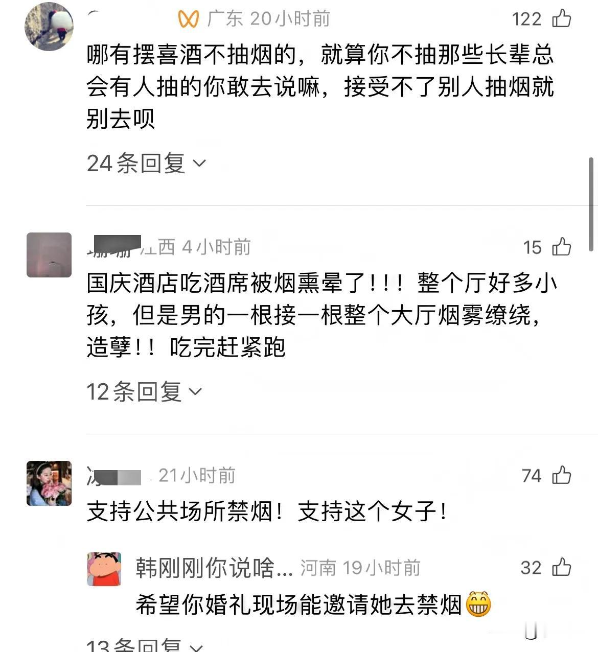 一女子去参加婚宴,发现有宾客吸烟,于是上前阻止,然而女子行为引起网友不满。网友:“你去吃席的,你有什么权利要求别人的婚宴禁止吸烟! 也有网友则支持女子做法,认为公共场合就应该禁烟! 我认为如果是公共场合,密闭空间,毕竟有很多老人和孩子,考虑到他们的健康,还是要尽量少吸烟的,实在忍不住烟瘾,可以去外面。 针对婚宴抽烟这件事,大家怎么看呢? 网友评论: 客人在婚宴上阻止吸烟! 有合理性但需更注重方式,核心是“委婉提醒、避免冲突”,毕竟作为宾客,需兼顾自身立场与婚宴的喜庆氛围。 若与吸烟者是熟人/亲友,可私下轻声提醒,比如“今天人多还有小孩,要不咱们去室外抽?”,用亲近的语气减少对方抵触。 最好优先找婚宴主办方(新人或其家人)反馈,由主办方当众幽默广告更合适,避免客人直接介入引发不快。 无论哪种方式,都尽量避免当众制止或强硬指责,以免破坏现场庆祝的氛围,毕竟婚宴的核心是祝福新人。 个人认为,公共场合,密闭空间,特别是夏天,开了空调,婚宴人很多,还有老人和孩子,考虑到他人的健康,还是要尽可能不要吸烟,实在忍不住烟瘾,可以去外面抽。 最主要的一个问题,这个人和一对新人是什么关系?!我是男的,今年四十多快五十了,我说话只代表个人观点。这女的如果是新娘的亲戚,如果我是新郎,会让老婆以后离这个人和她的小家庭远一点,她家以后有什么事不能去参加。如果她是女方的同事或是朋友,我会让老婆以后不能和她有任何联系,不能和她说任何一句话! 建议到外面抽烟是对的,我也是吸烟人士,我也不赞成在餐厅公共场所吸烟。 支持!室内必须禁烟!要么就划定单独的吸烟区!深圳做得还可以,酒楼大堂基本没遇到过抽烟的,有人一时忘记,服务员都会去提醒。服务员提醒还是置若罔闻的,只要拍下照片,提供时间地点,微信就可以提交投诉。 婚宴是私人宴会包场,不是公共场合。只要主人家每桌除了酒水外还都分放香烟,那就是允许宾客在宴席上随便抽。 宾客应该自觉到外面吸烟,但在婚宴上指责他人吸烟也欠妥,毕竟婚宴现场是个特定的时间特定的场合,不单破坏了现场气氛,也等于直接不级新郎新娘面子。 人可以不去参加,结婚这种场合烟酒必须的,虽然我不抽烟,但我也不反对别人抽烟,主要是酒席,多不给人家面子,实在受不了可以和抽烟说下我对烟有点受不了,可以一会少抽或换个地方,征求下別人意见,一般这种场合都多多少少认识或者男女方亲戚朋友也会给面子,没必要闹! 婚宴是一种特定的场所,宾客来自各个地方及层面,不宜强制禁烟,换个主题,如果是这个女子的喜事,她会这样做吗? 烟