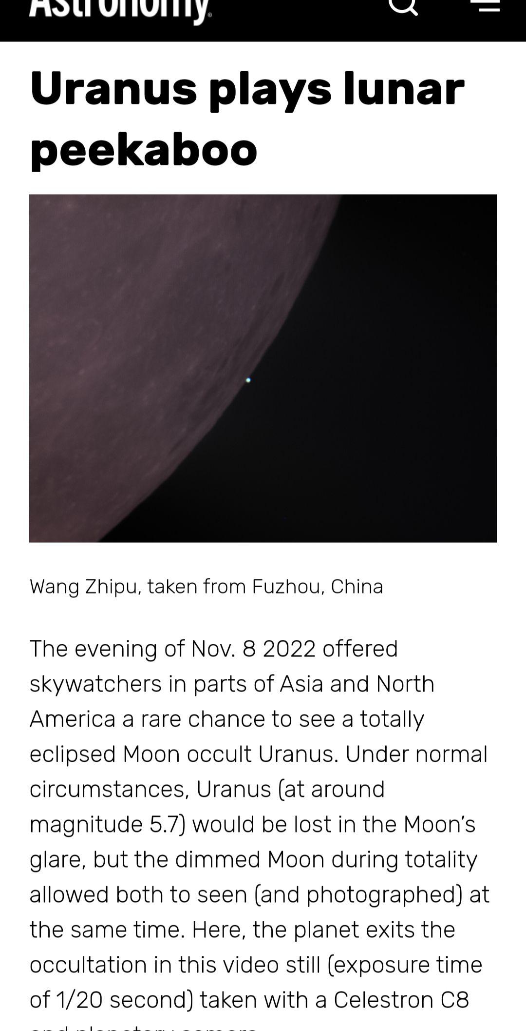荣登今日《Astronomy》每日一图!三年前拍摄的月掩天王星掩终时刻