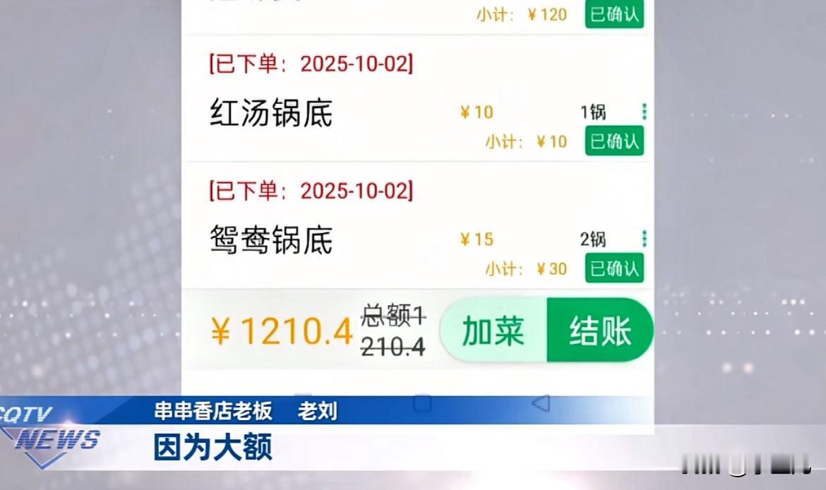 这也太大意了!男子带着一群人到店里吃串串消费1210元,把老板高兴坏了,然而男子结账扫码时,老板就去忙着给别的顾客结账,回来时才发现男子没有支付成功,然而人已经不见了! 事情发生在10月2日,当时男子带着一群人在店里消费,一共做了三桌,然而就是这么巧合,老板本以为男子结账成功了,也没注意看,就去忙别的客人了,谁知道会发生这种事! 老板对记者说:“当时男子喝了不少酒,应该是忘记输入密码了,自己挣点钱也不容易,希望男子看到新闻后,能过来结下账!” 我觉得他可能是喝多了,忘记输密码了,毕竟都知道现在到处都是监控摄像头,请客吃饭还能故意逃单吗?那不是搬起石头砸自己的脚吗? 值得赞扬的是这位老板,情商很高,发生这样的事,没有第一时间指责顾客,先礼后兵。 毕竟人家老板做点生意也不容意,希望男子看到视频后,能尽快去结账! 大家觉得呢?(信息来源:天天630新闻)