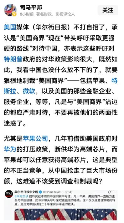 美国《华尔街日报》揭露一个惊天秘密,原来要求对我们采取强硬措施的并不是特朗普,而是以微软,英特尔,苹果为代表的华尔街科技公司。这些恶人吃着中国的饭,还要砸中国的锅,逼迫特朗普政府对我们采取更强硬的经济政策。而特朗普只是顺势挣些钱而已。 这些科技公司一边在中国市场赚得盆满钵满,一边却在推动对中国的限制措施。就拿苹果来说,中国市场常年贡献着其全球营收的五分之一以上,库克更是多次高调参加中国的展会,直言 “没有中国合作伙伴就没有苹果的今天”。 微软的 Office 软件、英特尔的芯片也长期占据中国市场的重要份额,中国庞大的用户群体和制造业基础为它们提供了丰厚利润。 但与此同时,这些公司却在暗中推动政策收紧。有报道显示,科技巨头们通过行业协会频繁向政府施压,以 “国家安全” 为由要求加强对华技术管控。 可有意思的是,当限制措施真正落地,受损的往往是它们自己。英特尔就曾因为禁止向华为供货,直接损失了一大笔稳定订单,公司内部甚至一度陷入是否要申请许可证恢复供货的纠结。 特朗普政府时期的关税政策和出口限制,看似是政府主导,实则正中部分科技公司下怀。它们希望通过政策打压中国本土企业,维持自己的市场垄断地位。但这种 “吃着中国饭砸中国锅” 的操作,很快就显现出反噬效应。 信息技术与创新基金会的报告显示,仅对新兴技术的严格出口限制,就可能让美国公司五年内损失超百亿美元,还会威胁到数万个工作岗位,其中半导体行业首当其冲。 更具戏剧性的是,这些科技公司在推动限制的同时,又会因为政策过于严苛而反过来游说政府。比如微软曾致信美国商务部,警告拟议的限制措施会让美国远离国际研究合作,“挫败美国利益”。 英伟达 CEO 黄仁勋更是直言,出口限制只会加速中国发展自身技术生态,最终让美国企业错失巨大市场,据他预测,到 2026 年中国在 AI 芯片和服务器上的支出可能达到 500 亿美元,而美国公司却因为限制只能眼睁睁看着机会溜走。 特朗普在这其中更像是个 “机会主义者”,借着科技公司的推动出台政策,既能迎合部分利益集团,又能通过关税等手段充盈国库。 但他或许没料到,这种被利益裹挟的政策,最终让美国科技行业陷入了尴尬境地:想遏制中国技术发展,却反而加速了中国的自主创新,华为手机重回中国市场销量榜首,中国芯片出口额更是在制裁下实现翻倍,而美国企业却在全球供应链中逐渐失去优势。 现在美国商会主张对我们来硬的,不过,已经发生的事实已经证明,美国高估了自己,也低估了我们,我们绝不会成为美国予取予夺的对象。很显然,在维系全球自由贸易方面,美国已经越来越成为一个破坏者,我们不会对美国的行为听之任之。 信源:观察者网,华尔街日报网