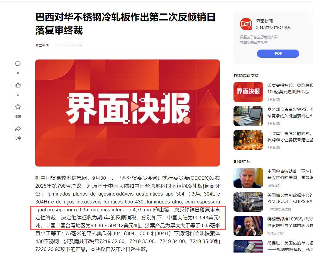 巴西外贸委员会正式宣布,对来自中国的不锈钢冷轧板,将继续以903.48美元/吨的标准征收反倾销税,征期足足五年。 早在 2012 年 4 月,巴西就盯着中国、韩国、德国等八个国家和地区的不锈钢冷轧板下手了,第一轮调查折腾到 2013 年,最后给中国和中国台湾地区定了罪,开征反倾销税。 2018 年搞第一次日落复审,结果是接着征五年,现在 2025 年又来一遍,说白了就是铁了心要把这道门槛焊死在那儿。 这 903.48 美元 / 吨的税到底有多狠?看看 2023 年的数据就知道,中国钢材出口的平均单价才 936.8 美元 / 吨,这税几乎快赶上一整吨钢材的均价了,相当于给中国产品凭空加了近一倍的成本。 更有意思的是,巴西对中国台湾地区收的税是 93.36 到 504.12 美元 / 吨,悬殊这么大,明摆着就是针对性十足。要知道 2023 年中国对巴西的钢材出口增幅可是超过 60% 的,在巴西 75% 的亚洲不锈钢进口里,中国产品占了不小的份额,这么猛的竞争力,让巴西本土企业根本扛不住,只能找政府求救。 这次申请发起调查的就是巴西本土企业 Aperam Inox América do Sul S.A.,说白了就是自家生意被抢了,得找个 “倾销” 的由头把对手挡在门外。 其实这已经不是巴西第一次对中国不锈钢产品动手了,2025 年 7 月他们刚对中国的圆形焊接奥氏体不锈钢管续征了五年反倾销税,税额高达 1340.52 美元 / 吨,涉案的贸易额就超过 1.3 亿美元。 这套路一模一样,都是先调查再征税,到期了就搞日落复审续期,把临时措施变成长期壁垒。究其原因,还是中国不锈钢产业的实力太能打了,2024 年全球不锈钢粗钢产量 6260 万吨,中国一家就占了 3944.1 万吨,同比还涨了 7.5%,这种产能规模带来的成本优势,巴西本土企业根本没法比。 巴西自己的不锈钢产量在 2024 年第四季度才 195.4 万吨,环比还降了 3.7%,实力悬殊摆在这儿,不靠关税保护,本土钢厂恐怕早就撑不下去了。 更值得说道的是,这种贸易保护其实是笔糊涂账。巴西一边把 70% 以上的大豆和铁矿砂都卖给中国,靠着初级产品赚得盆满钵满,2024 年前 10 个月中巴贸易额都涨到 1.14 万亿元人民币了;另一边却在工业制成品上处处设卡,除了不锈钢,之前还对中国的钢板加征过进口关税,冷轧不锈钢卷的关税早就提上去了。 这种矛盾操作其实很吃亏,巴西的制造业需要不锈钢冷轧板这种原材料,加税后成本涨了,最后还是本土企业和消费者买单。就像土耳其之前加征钢材关税,结果本土钢厂成本没降下来,反而从净出口国变成了净进口国,最后还是得依赖进口,只是换了个更贵的渠道。 从规则层面看,巴西这套操作其实就是钻了 WTO 反倾销协议的空子。协议里说倾销是出口价低于正常价值,可这个 “正常价值” 怎么算全凭进口国说了算,很容易被拿来做文章。 中国企业其实是靠着全产业链优势和规模效应才有的价格竞争力,不是什么恶意倾销。2023 年人民币对巴西货币贬值 2%-4%,进一步放大了价格优势,但这都是市场规律作用的结果,根本算不上倾销。 可巴西不管这些,只要本土产业受损了,就把帽子扣过来,这种做法其实连他们自己人都未必真信,毕竟 2019 年第一次复审时,他们就取消了对德国、韩国等国的征税,唯独盯着中国和中国台湾地区,这针对性再明显不过了。 有意思的是,中国其实也在应对这类贸易保护,2025 年 6 月商务部就对欧盟、英国、韩国和印度尼西亚的不锈钢钢坯续征了反倾销税,税率最高达 103.1%,这算是以其人之道还治。 但对于巴西来说,这种保护政策其实是饮鸩止渴,2024 年全球不锈钢产能还在增长,欧洲、美国都在扩产,巴西靠着关税把中国产品挡在门外,反而可能给其他国家的产品腾出市场,最后自己的产业还是得不到真正的发展。 而且中国企业也在想办法应对,要么转向其他市场,要么调整出口结构,2023 年中国不锈钢出口虽然降了 9.1%,但特钢出口涨了 16.5%,总能找到新的突破口。 说到底,巴西这波续征反倾销税,本质上就是本土产业竞争力不足的无奈之举,用五年的时间换个喘息机会。 可中国不锈钢的产能和技术优势摆在那儿,全球市场的需求也实实在在,就算巴西关上门,中国产品还能卖到印度、阿联酋这些地方,2023 年对这些地区的出口增幅都超过 60%。 倒是巴西自己,一边享受着中国巨大的初级产品市场,一边在工业领域搞保护,这种一边赚钱一边设卡的操作,长期来看反而会拖累自身的产业升级,毕竟没有竞争压力,本土企业也很难有动力去提升技术、降低成本,最后可能还是摆脱不了依赖进口的命运,只不过花的钱更多了而已。