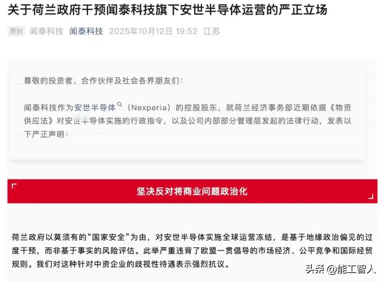 荷兰冻结中企资产,稀土反制火药味浓,谁在改写国际规则? 2024年9月底,荷兰政府突然对安世半导体下了命令,这家公司是闻泰科技旗下的,总部设在欧洲,理由是国家安全,资产和专利都被冻结,高管不能更换,股权交由第三方托管,中方派去的管理人员全部被架空,一年内不得有任何变动。 这个命令10月9日才公布,那天中国刚说要管稀土出口,不是不卖,是每单都得审批,时间碰得太巧了,谁都看得出来不是偶然,以前荷兰卡的是阿斯麦光刻机,不给中国卖,这次不一样,是把已经买下的企业直接扣住,这已经不是技术封锁了,是冲着钱和地盘来的。 安世半导体不是小公司,它做汽车芯片和快充芯片,全球第一,新能源车离不开它,荷兰这一手,其实是想逼中国让步,中国管着稀土,阿斯麦的光刻机要用很多稀土材料,磁铁、激光晶体都靠中国供,没这些,机器就造不出来,荷兰想用抢资产换你松口子。 这事法律上站不住脚,安世是正经买来的,荷兰没道理单方面冻结,WTO的规则里也没这一条,产业上先伤了自己人,欧洲车企都在用安世的芯片,突然断供,生产线就得停,德国那边已经慌了,政治上更明白,荷兰不是自己做主,是美国拉着欧洲搞长臂管辖,德国以前也拦过中企买设备公司,手法一模一样。 中国也不是任人拿捏的,稀土出口审批不是用来打人的棍子,是自己保命的底牌,西方要是继续这么干,下一步中国可能就少给配额,不卖高纯度材料,连加工技术都不教了,你敢抢,我就敢断,这不是买卖上的扯皮,是定规矩的较量,看谁最后能把游戏规则改了。 有人拿这事跟八十年代美国打压日本半导体比,那时候美国说日本倾销,逼着日本交出技术,今天荷兰说安全,逼中国让步,说到底,强的一方总能找到理由压人,但中国不一样,手里有稀土,有市场,有完整的产业链,反击的本事比当年的日本强多了。 安世现在还在正常运转,荷兰也没拿出什么实打实的安全证据,大家都在等着看下一步,中国会不会把审批范围扩大,比如氧化镨钕、镝铁合金这些关键材料,阿斯麦能不能绕开中国的供应链,目前看,根本绕不开,欧盟内部有没有人站出来反对,到现在还没动静。 这场仗才刚开头,不是比芯片,是比规矩,不是看谁技术强,是看谁熬得久,荷兰先动了手,中国没退,接下来就看谁先扛不住。