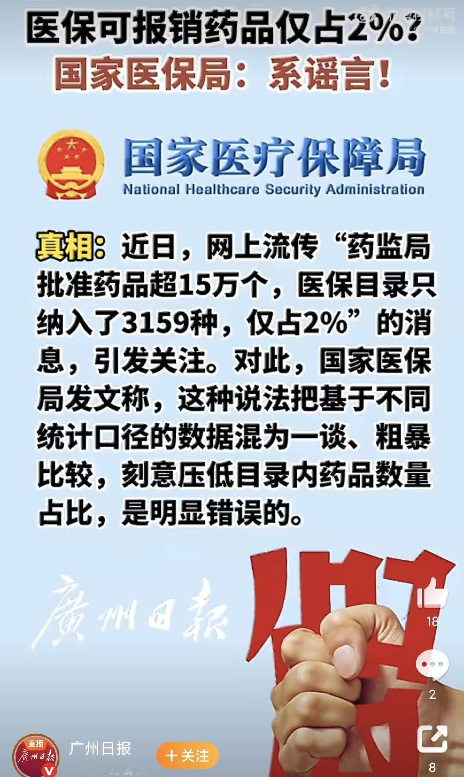 国家医保局说,网上传的医保能报销的药只占2%,这说法不对。药监局的15万是按批准
