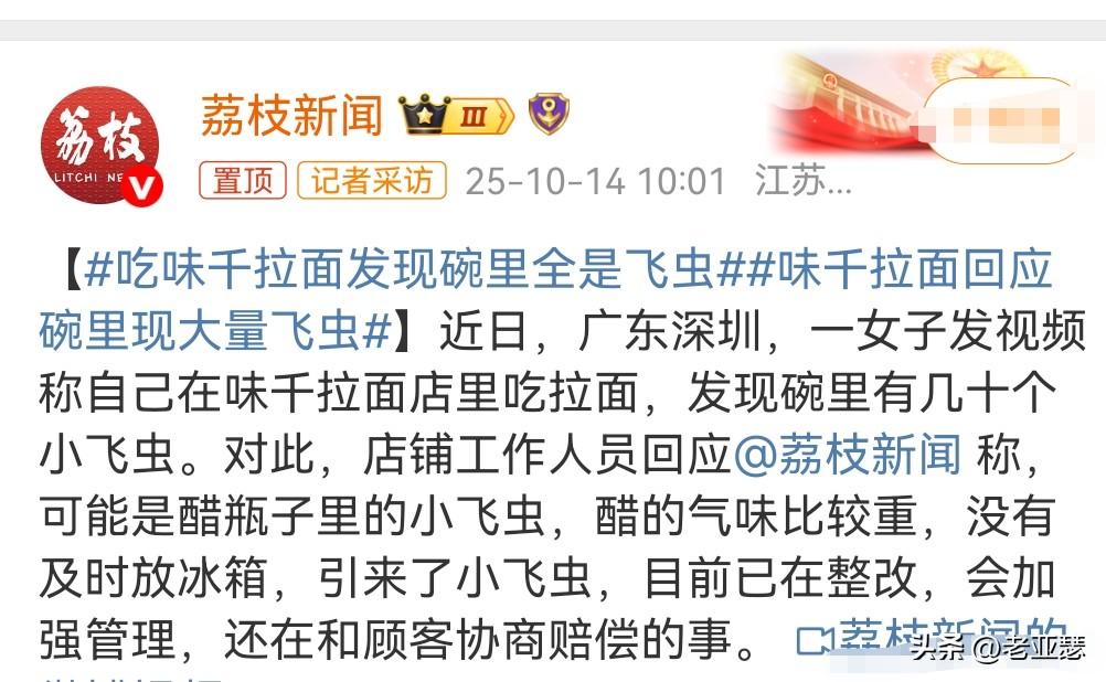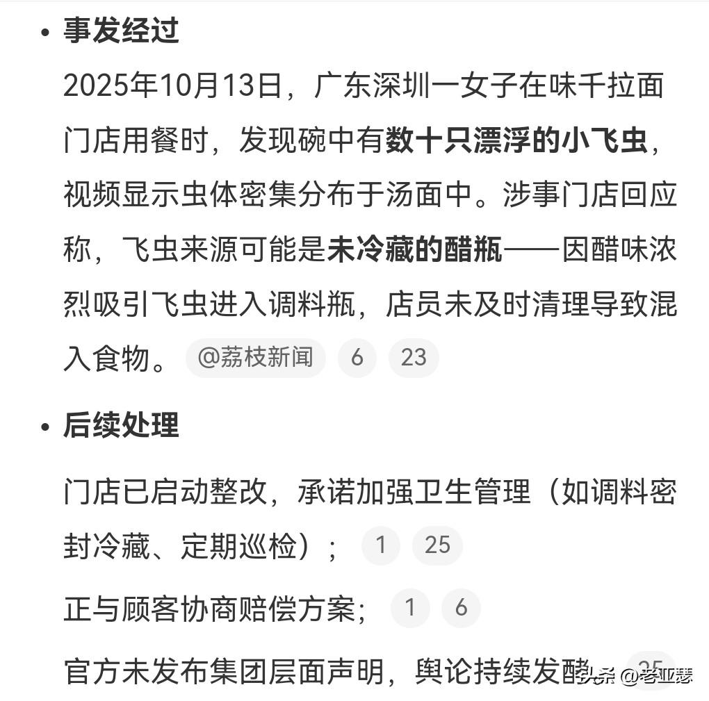 这也太恶心了吧。这是一起严重的卫生安全事故。 10月14日看到这么个消息。 近日广东深圳一女子发视频称,吃味千拉面发现碗里全是飞虫。 数量竟然高达几十只,这真的是大倒胃口。 店家说是从醋瓶子里面进去的。 味千拉面在多年前被曝出汤底竟然是用东西勾兑出来的。 这真的是太没诚意了。 所以说这个品牌的东西又贵低质量又不好。 已经倒了很多家了。