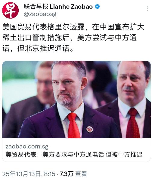 新加坡联合早报10月13日报道:“美国贸易代表格里尔透露,在中国宣布扩大稀土出口管制措施后,美方尝试与中方通话,但北京推迟通话。” 稀土这东西可不是普通矿产,往小了说关系到手机、电脑的零件,往大了说导弹制导、隐身涂层、新能源电池这些高精尖领域,没它根本玩不转。 全球稀土储量不算少,但中国手里攥着的是实打实的话语权——不光储量占全球30%以上,更关键的是提炼加工能力,全世界近90%的稀土分离提纯产能都在中国。美国自己也有稀土矿,可从挖矿到变成能用的材料,产业链断了好多年,现在想重建,没个三五年根本搭不起来。 这次中国扩大出口管制,不是拍脑袋决定的。之前已经对部分稀土相关产品设了限制,这次范围更广,不光包括稀土金属本身,还有经过初步加工的合金、化合物,甚至连生产这些产品的关键技术资料,都在管制之列。 这步棋一落,美国那些依赖中国稀土的行业立马慌了神。就说美国的新能源车企,每辆车的电池里都得用稀土元素钕、镝,要是断了供,生产线就得停摆;还有军工领域,F-35战机的发动机、“爱国者”导弹的制导系统,缺了稀土根本造不出来。 美方急着要通话,就是想让中国松口,最好能取消或者放宽管制。格里尔在公开场合没明说通话内容,但业内都猜得到,无非是想讨价还价,比如承诺给中国点贸易上的小好处,换稀土的稳定供应。 可中方为啥要推迟通话?这里面的考量很实在——之前美方可不是第一次在稀土问题上耍花样,一边喊着要“供应链自主”,一边又不想放弃中国的低价稀土,甚至还联合日本、澳大利亚搞“稀土联盟”,想绕过中国。这种情况下,中方不可能轻易接话,得让美方先想明白,光靠嘴上说没用,得拿出实实在在的诚意。 其实美国早该有危机感了。2023年的时候,美国从中国进口的稀土占比还高达85%,虽然这两年一直在找替代来源,比如从澳大利亚的矿山进口稀土矿,但这些矿运回去之后,还得送到中国来加工,因为美国自己没能力处理。 今年上半年,美国想在本土建一座稀土分离厂,结果因为技术不过关、成本太高,工期一推再推,到现在还没投产。 反观中国,不光在稀土加工技术上领先,还在不断完善产业链,从矿山开采到回收利用,形成了闭环,连“零污染”的提炼技术都突破了,这可不是美国短期内能追上的。 中方推迟通话,还有一层意思是想让美方正视贸易不平衡的问题。这些年,美国对中国的高科技产品层层设限,芯片、光刻机、人工智能技术,能禁的都禁了,可转过头来又想让中国无限制供应稀土这种战略资源,天下哪有这么好的事? 之前中方就明确说过,稀土出口管制是为了保护资源和环境,也是维护国家安全的必要措施,这是每个国家都有的权利。美方要是想解决稀土问题,首先得取消对中国的技术封锁,别搞双重标准。 现在美国国内的行业协会已经开始给政府施压了。美国汽车制造商协会最近给白宫递了报告,说要是稀土供应断了,2025年美国新能源汽车产量得减少30%,直接影响几十万个就业岗位; 美国国防工业协会也警告,稀土短缺会导致军工订单延误,影响国家安全。这些压力都传到了格里尔那里,所以他才这么急着要跟中方沟通,可中方不吃“急病乱投医”那一套,得按规矩来,按节奏来。 还有个细节值得注意,这次中方扩大管制,不是针对美国一家,而是面向全球所有国家,只要涉及到敏感应用领域的稀土出口,都得经过严格审批。 这就堵死了美国想通过第三国转口的路子——之前美国试过让日本从中国买稀土,再转手卖给自己,结果这次管制把转口贸易也纳入了监管,只要最终用途是美国的敏感行业,一样不批。这一下就断了美国的后路,也让其他国家明白,想当“中间商赚差价”没戏。 美方现在的处境挺尴尬的,想硬扛吧,行业撑不住;想妥协吧,又拉不下脸。格里尔在接受采访的时候,还嘴硬说“美方有能力应对供应链挑战”,可背地里已经让美国商务部去跟中国相关部门沟通,希望能“尽快安排通话”。 但中方的态度很明确,沟通可以,但得在平等互利的基础上,不能美方想谈就谈,想怎么谈就怎么谈。之前几次中美贸易对话,美方总是出尔反尔,谈好的事情转头就变卦,这种情况下,中方当然要更谨慎,不能轻易相信美方的口头承诺。