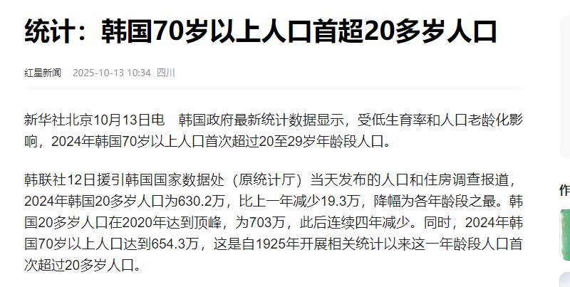 韩国扔出一枚“人口炸弹”:70岁以上老头老太太人数居然超过了20多岁的年轻人,这可是史上头一遭啊!说白了,这个国家正在以肉眼可见的速度“变老”,低生育率让新生儿数量连年暴跌,去年只有23万人出生,而死亡人数却蹭蹭往上涨,人口负增长就像刹车失灵的汽车根本停不下来。 韩国这枚“人口炸弹”炸得确实突然,但仔细琢磨就知道,这早是积年累月的老问题攒出来的祸事,2024年70岁以上人口654.3万超过20多岁的630.2万,不过是把藏在底下的危机摆到了明面上,这可是从1925年有统计以来头一回见这种“老少倒挂”的光景。 更让人揪心的是,这不是一时的波动,而是看得见的加速滑坡,20多岁人口2020年还到过703万的顶峰,短短四年就少了70多万,一年能跌19万多,是所有年龄段里降得最快的,反观70岁以上的老人,四年里倒多了80万,增速快得吓人。 再看整体人口结构,现在50多岁的人最多,有871.3万,跟着是40多岁和60多岁的,跟三十年前20多岁年轻人占主力的样子比,简直是换了个底朝天,这国家是真的在以肉眼可见的速度“变老”。 根子还是出在低生育率上,这可不是近几年才降下来的,早就一路往下滑,2021年起就成了发达国家里生育率最低的,2023年新生儿才23万,一个女的一辈子平均就生0.72个娃,连维持人口的一半都不够,这样下去年轻人自然越来越少。 为啥年轻人不愿生孩子?最实在的就是没钱没底气,先说结婚,在韩国娶个媳妇、安个家,平均得准备3.4亿韩元,差不多180万人民币,光买房的钱就得2.6亿韩元,合130万人民币,首尔的房子更是贵得离谱,就算在周边城市,想买个90平米的公寓都得咬碎牙,不少年轻人只能买60平米的小房子,连自己住都紧巴,哪敢谈结婚。 就算咬咬牙结了婚,养孩子的成本更让人望而却步,把一个孩子从生下来养到长大,平均得花3.8亿韩元,也就是200万人民币,光从幼儿园到高中毕业就得150万。 韩国的教育竞争早就卷到骨子里,幼儿园就得报各种课外班,想考个好大学,孩子每天睡觉都超不过5个小时,连“四上五下”(睡四小时能考上,睡五小时就落榜)都成了公认的说法,家长既掏不起钱,也不忍心让孩子遭这份罪。 更要命的是年轻人的工作根本不稳定,20多岁的就业率都降到60.5%了,还在往下滑,失业率反倒涨到5%,创了好几年的新高。 大企业现在不爱招应届生,更愿意要有经验的人,优质岗位本来就少,年轻人想找个能养家的工作都难,自己都养不踏实,怎么敢生娃。 除了钱和工作的压力,年轻人的想法也变了,现在的韩国年轻人更看重自己过得舒服,觉得结婚生娃不是必选项,42.7%的20到39岁未婚年轻人都觉得“不结婚也行”,已婚的里近四分之一都选择不生孩子。 他们宁愿养宠物,现在韩国的宠物产业规模都超过婴幼儿用品市场了,觉得养宠物轻松自由,不用承担养孩子的巨大压力和责任,这种观念的转变,比经济压力更难扭转。 这边新生儿越生越少,那边老人却越来越多,65岁以上的人口都占了总人口的20%,正式进入“超老龄社会”了,而且老年贫困率高达40.4%,在发达国家里是最高的,好多老人根本没钱养老。 更头疼的是养老金也快扛不住了,现在韩国养老金有1227万亿韩元的盘子,看着不少,但要是不改革,到2056年就花光了。 没办法只能改政策,以后缴费率要从9%涨到13%,一个普通上班族交四十年社保,得多交28万人民币,可拿到的养老金也就多一点,年轻人本来压力就大,这下负担更重了,反而更不敢生孩子,形成了恶性循环。 劳动力减少更是直接戳中经济的软肋,2024年能干活的15到64岁人口比上年少了28.3万,企业招不到人,成本就得涨,像半导体那些带动经济的行业,本来就不需要太多人,能提供的岗位有限,劳动力一缺,发展更没动力。 专家都警告说,年轻人少加上就业难,已经成了经济的“结构性危机”,中长期肯定会拖慢整个社会的增长脚步。 韩国政府不是没试过救,早在2005年就出台了鼓励生育的法律,后来又搞育儿补贴、增加育儿设施,首尔前两年还推了“助力新生计划”,新增了2700个育儿点,有时候新生儿数量能短暂涨一点,但没多久又掉下去了。 说到底这些政策都是“杯水车薪”,房价、教育、就业这些真正的大难题没解决,年轻人的生育意愿就提不上来,该不生还是不生。 按照现在的趋势,韩国总人口已经连续五年减少,智库预测最悲观的话,一百年后人口能从现在的5100多万跌到753万,少85%,到时候100个干活的得养140个老人,那日子真不敢想。 低生育率让年轻人越来越少,老龄化让老人越来越多,年轻人压力大更不愿生,老人多了养老金和医疗负担更重,反过来又压得年轻人喘不过气,越陷越深,想停下来真是难上加难。