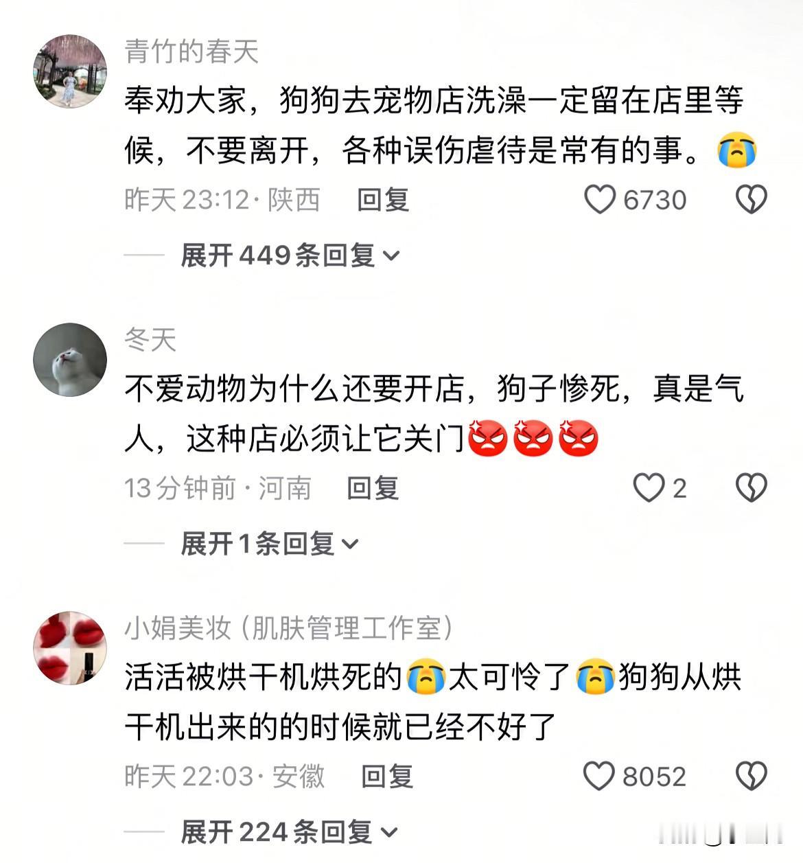 还有点良心吗!男子带着爱狗去店里洗澡,没想到狗回家后突然异常,出现大小便失禁抽搐,男子赶紧带着它去医院,然而狗却抢救无效死亡。直到男子查看宠物店监控那一幕,再也忍不住了! 男子怎么也没想到,就因为带着爱狗出去洗了个澡,狗狗就彻底离开了他。 看到监控画面,店员给狗洗澡的时候,用暴力手段洗澡,并且把狗放进了烘干箱一个半小时。 等狗出来的时候,精神状态就已经很差了,接回家就出现异常,尽管送往了医院,还是没能救回来。 男子伤心至极,和媒体曝光了这件事。 这个狗看着挺温顺的,没想到经历了这样的虐待,宠物店人员必须负全责,如果没有爱心就不要干这一行,靠宠物吃饭,还砸自己的锅,不知是怎么想的? 另外这件事提醒大家给狗狗洗澡的时候,主人最好在身边,避免再出现这样的事情受到伤害。 (信息来源:中安新闻)